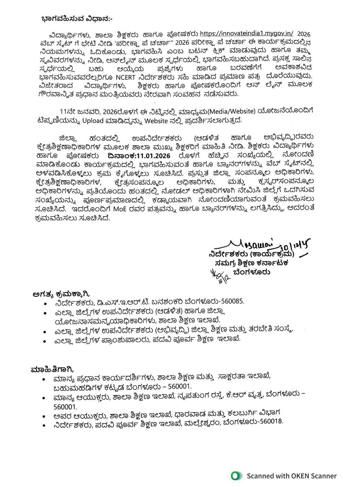 “ಪರೀಕ್ಷಾ ಪೆ ಚರ್ಚಾ”ದ 2025 8ನೇ ಆವೃತ್ತಿಯಲ್ಲಿ 5 ಕೋಟಿ ವಿದ್ಯಾರ್ಥಿಗಳು, ಪೋಷಕರು ಮತ್ತು ಶಿಕ್ಷಕರು ದೇಶಾದ್ಯಂತ ಭಾಗವಹಿಸಿರುತ್ತಾರೆ. ದಿನಾಂಕ:01.12.2025 ರಿಂದ 11.01.2026ರ ವರೆಗೆ 6 ರಿಂದ 12ನೇ ತರಗತಿಯಲ್ಲಿರುವ ವಿದ್ಯಾರ್ಥಿಗಳು, ಪೋಷಕರು ಮತ್ತು ಶಿಕ್ಷಕರು ಭಾಗವಹಿಸಲು ಸೂಚಿಸಿದೆ.