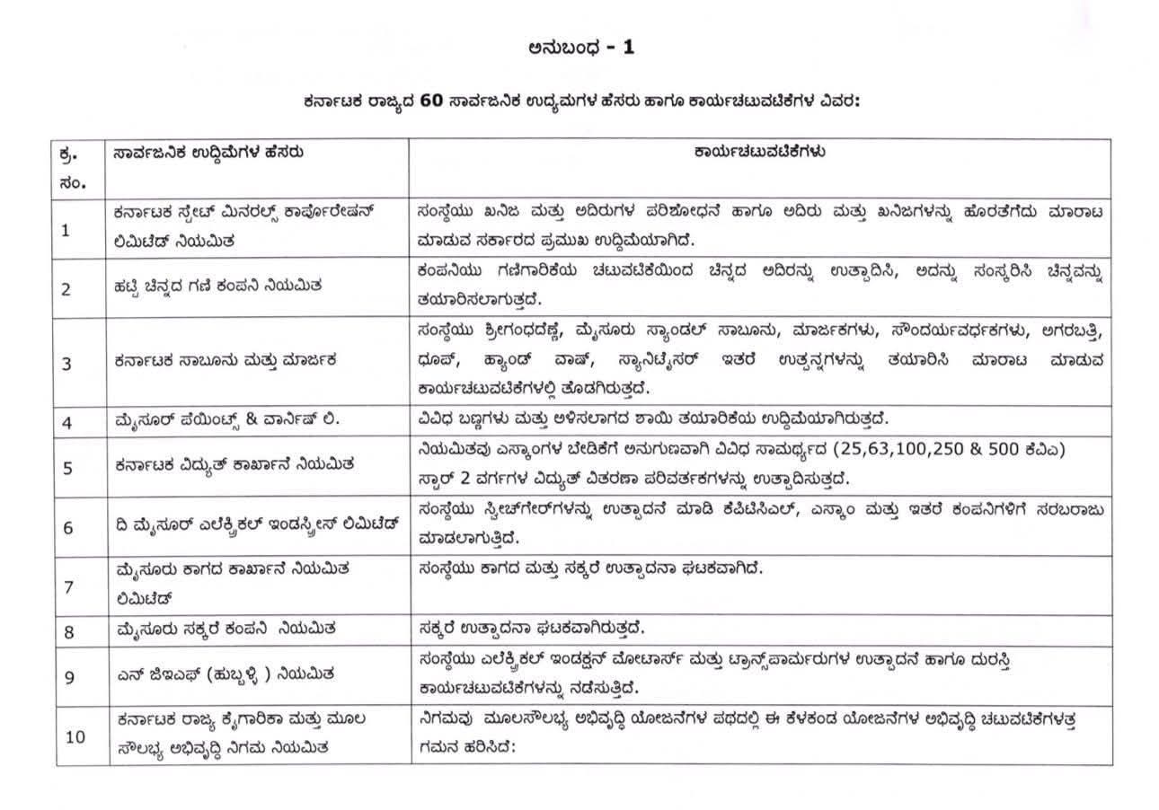 ಬೆಂಗಳೂರು : ರಾಜ್ಯದ ಜನತೆಯ ಗಮನಕ್ಕೆ, ಕರ್ನಾಟಕ ರಾಜ್ಯದ 60 ಸಾರ್ವಜನಿಕ ಉದ್ಯಮಗಳ ಹೆಸರು ಹಾಗೂ ಕಾರ್ಯಚಟುವಟಿಕೆಗಳ ಕುರಿತು ಇಲ್ಲಿದೆ ಸಂಪೂರ್ಣ ಮಾಹಿತಿ.