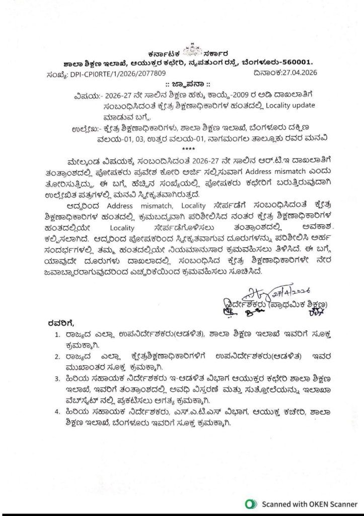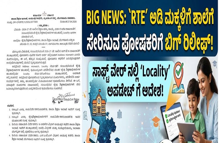 ಬೆಂಗಳೂರು: 2026-27ನೇ ಸಾಲಿನ ಶಿಕ್ಷಣ ಹಕ್ಕು ಕಾಯ್ದೆ (RTE) ಅಡಿಯಲ್ಲಿ ಖಾಸಗಿ ಶಾಲೆಗಳ ಪ್ರವೇಶಾತಿಗಾಗಿ ಅರ್ಜಿ ಸಲ್ಲಿಸುತ್ತಿರುವ ಪೋಷಕರಿಗೆ ಎದುರಾಗಿದ್ದ ತಾಂತ್ರಿಕ ಸಮಸ್ಯೆಗೆ ಶಿಕ್ಷಣ ಇಲಾಖೆ ಪರಿಹಾರ ನೀಡಿದೆ. ಆನ್ಲೈನ್ ಅರ್ಜಿಯಲ್ಲಿ ಕಂಡುಬರುತ್ತಿದ್ದ ‘ವಿಳಾಸ ವ್ಯತ್ಯಾಸ’ (Address Mismatch) ಸಮಸ್ಯೆಯನ್ನು ಬಗೆಹರಿಸಲು ಆಯಾ ತಾಲ್ಲೂಕಿನ ಕ್ಷೇತ್ರ ಶಿಕ್ಷಣಾಧಿಕಾರಿಗಳಿಗೆ (BEO) ಅಧಿಕಾರ ನೀಡಿ ಆದೇಶ ಹೊರಡಿಸಲಾಗಿದೆ.