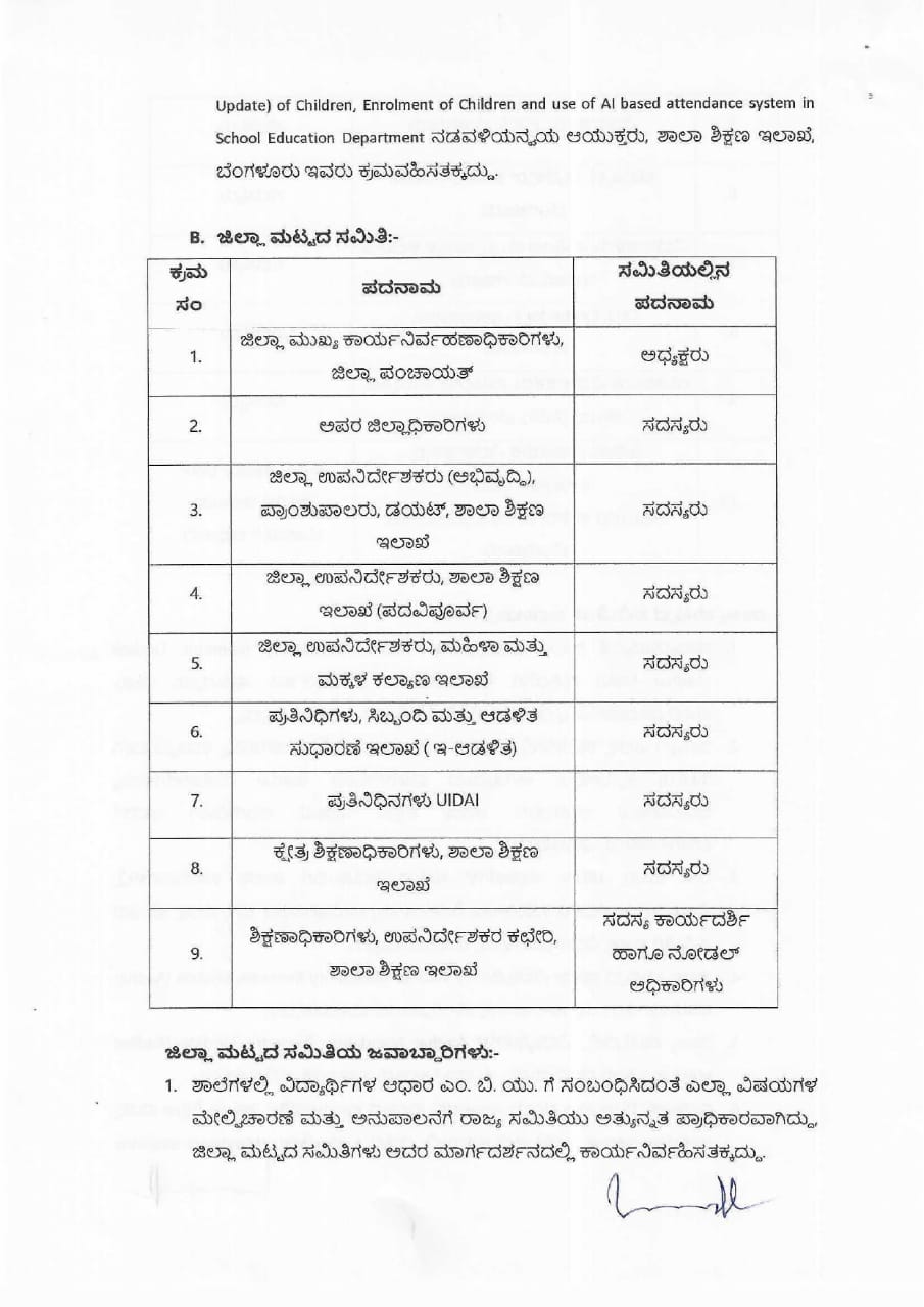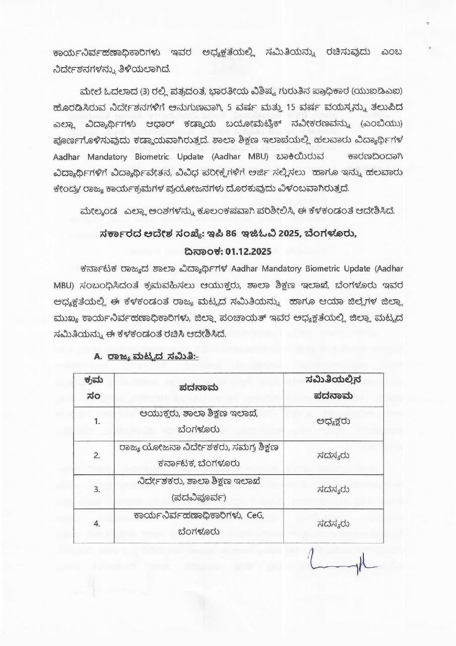 ಮೇಲ್ಕಂಡ ಎಲ್ಲಾ ಅಂಶಗಳನ್ನು ಕೂಲಂಕಷವಾಗಿ ಪರಿಶೀಲಿಸಿ, ಈ ಕೆಳಕಂಡಂತೆ ಆದೇಶಿಸಿದೆ. ಆಧಾರ್ ಕಡ್ಡಾಯ ಬಯೋಮೆಟ್ರಿಕ್ ನವೀಕರಣ (ಆಧಾರ್) MBU) ಸಂಬಂಧಿಸಿದಂತೆ ಕ್ರಮವಹಿಸಲು ಆಯುಕ್ತರು, ಶಾಲಾ ಶಿಕ್ಷಣ ಇಲಾಖೆ, ಬೆಂಗಳೂರು ಇವರ ಅಧ್ಯಕ್ಷತೆಯಲ್ಲಿ ಈ ಕೆಳಕಂಡಂತೆ ರಾಜ್ಯ ಮಟ್ಟದ ಸಮಿತಿಯನ್ನು ಹಾಗೂ ಆಯಾ ಜಿಲ್ಲೆಗಳ ಜಿಲ್ಲಾ ಮುಖ್ಯ ಕಾರ್ಯನಿರ್ವಹಣಾಧಿಕಾರಿಗಳು, ಜಿಲ್ಲಾ ಪಂಚಾಯತ್ ಇವರ ಅಧ್ಯಕ್ಷತೆಯಲ್ಲಿ ಜಿಲ್ಲಾ ಮಟ್ಟದ ಸಮಿತಿಯನ್ನು ಈ ಕೆಳಕಂಡಂತೆ ರಚಿಸಿ ಆದೇಶಿಸಿದೆ.