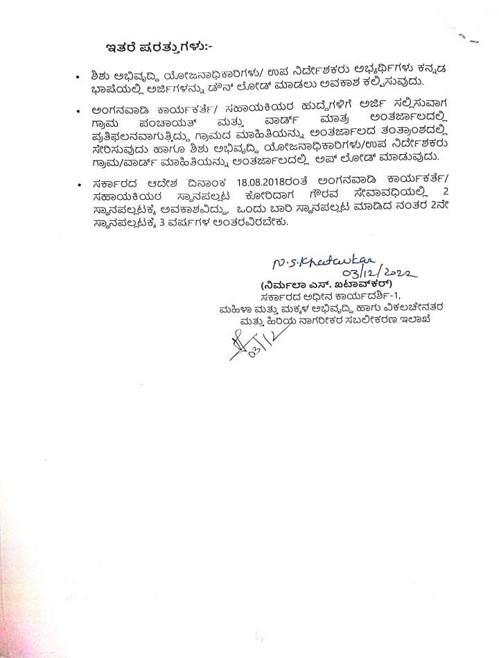 ಅಂಗನವಾಡಿ ಕಾರ್ಯಕರ್ತೆ ಹಾಗೂ ಸಹಾಯಕಿ ಹುದ್ದೆಗೆ ಶೇ. 25 ರಷ್ಟು ಅಲ್ಪಸಂಖ್ಯಾತ ಸಮುದಾಯದ ಜನಸಂಖ್ಯೆ ಇರುವ ಪ್ರದೇಶದ ಅಂಗನವಾಡಿ ಕೇಂದ್ರಗಳಲ್ಲಿ ಕನ್ನಡ ಭಾಷೆಯೊಂದಿಗೆ ಆಯಾ ಅಲ್ಪಸಂಖ್ಯಾತ ಸಮುದಾಯದ ಭಾಷೆ ಬಲ್ಲವರನ್ನು ಕಾರ್ಯಕರ್ತೆ / ಸಹಾಯಕಿಯ ಹುದ್ದೆಗೆ ಆಯ್ಕೆ ಮಾಡುವುದು. ಅಂಗನವಾಡಿ ಕಾರ್ಯಕರ್ತೆ / ಸಹಾಯಕಿ ಹುದ್ದೆಗೆ ಅರ್ಜಿ ಸಲ್ಲಿಸಿದವರಲ್ಲಿ ಒಂದಕ್ಕಿಂತ ಹೆಚ್ಚು ಅಭ್ಯರ್ಥಿಗಳು ಸಮಾನ ಅಂಕಗಳಿಸಿದ್ದಲ್ಲಿ ವಯೋಹಿರಿತನವನ್ನು ಪರಿಗಣಿಸಬೇಕು. ವಯಸ್ಸು ಸಮಾನವಾಗಿದ್ದಲ್ಲಿ ವಿಧವೆಯರನ್ನು ಪರಿಗಣಿಸಬೇಕು.