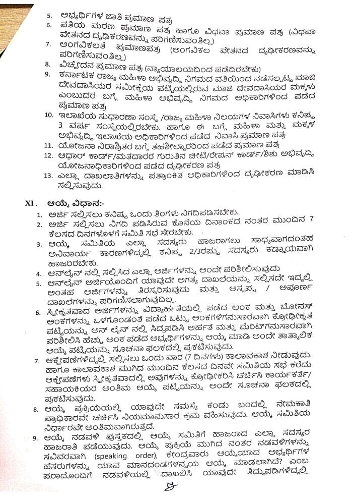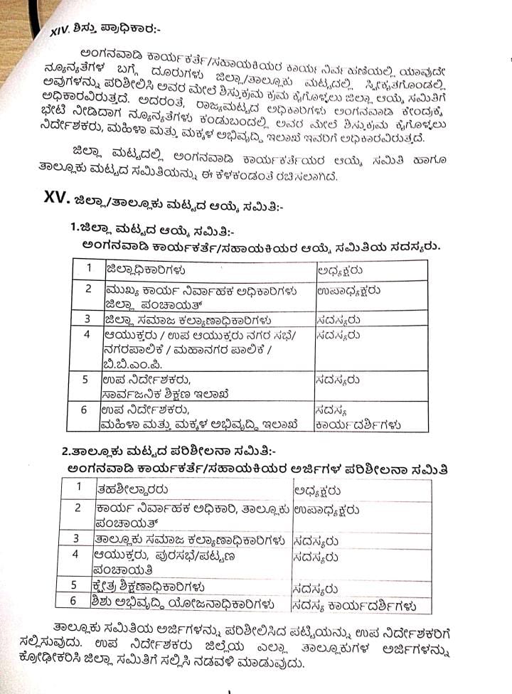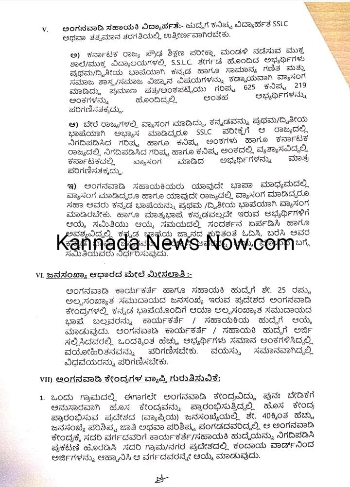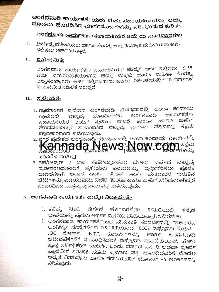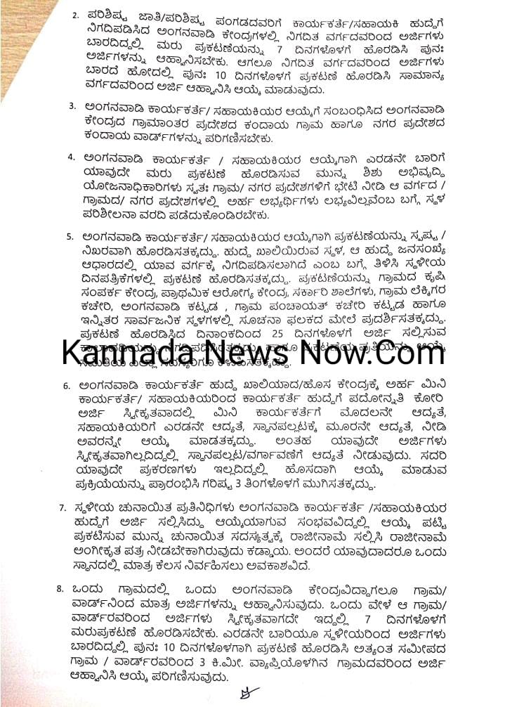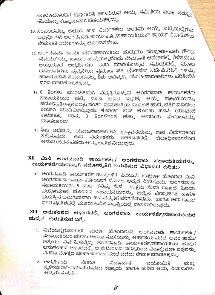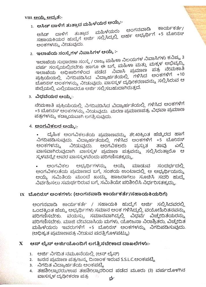 ಅಂಗನವಾಡಿ ಕಾರ್ಯಕರ್ತೆ ಹಾಗೂ ಸಹಾಯಕಿ ಹುದ್ದೆಗೆ ಶೇ. 25 ರಷ್ಟು ಅಲ್ಪಸಂಖ್ಯಾತ ಸಮುದಾಯದ ಜನಸಂಖ್ಯೆ ಇರುವ ಪ್ರದೇಶದ ಅಂಗನವಾಡಿ ಕೇಂದ್ರಗಳಲ್ಲಿ ಕನ್ನಡ ಭಾಷೆಯೊಂದಿಗೆ ಆಯಾ ಅಲ್ಪಸಂಖ್ಯಾತ ಸಮುದಾಯದ ಭಾಷೆ ಬಲ್ಲವರನ್ನು ಕಾರ್ಯಕರ್ತೆ / ಸಹಾಯಕಿಯ ಹುದ್ದೆಗೆ ಆಯ್ಕೆ ಮಾಡುವುದು. ಅಂಗನವಾಡಿ ಕಾರ್ಯಕರ್ತೆ / ಸಹಾಯಕಿ ಹುದ್ದೆಗೆ ಅರ್ಜಿ ಸಲ್ಲಿಸಿದವರಲ್ಲಿ ಒಂದಕ್ಕಿಂತ ಹೆಚ್ಚು ಅಭ್ಯರ್ಥಿಗಳು ಸಮಾನ ಅಂಕಗಳಿಸಿದ್ದಲ್ಲಿ ವಯೋಹಿರಿತನವನ್ನು ಪರಿಗಣಿಸಬೇಕು. ವಯಸ್ಸು ಸಮಾನವಾಗಿದ್ದಲ್ಲಿ ವಿಧವೆಯರನ್ನು ಪರಿಗಣಿಸಬೇಕು.