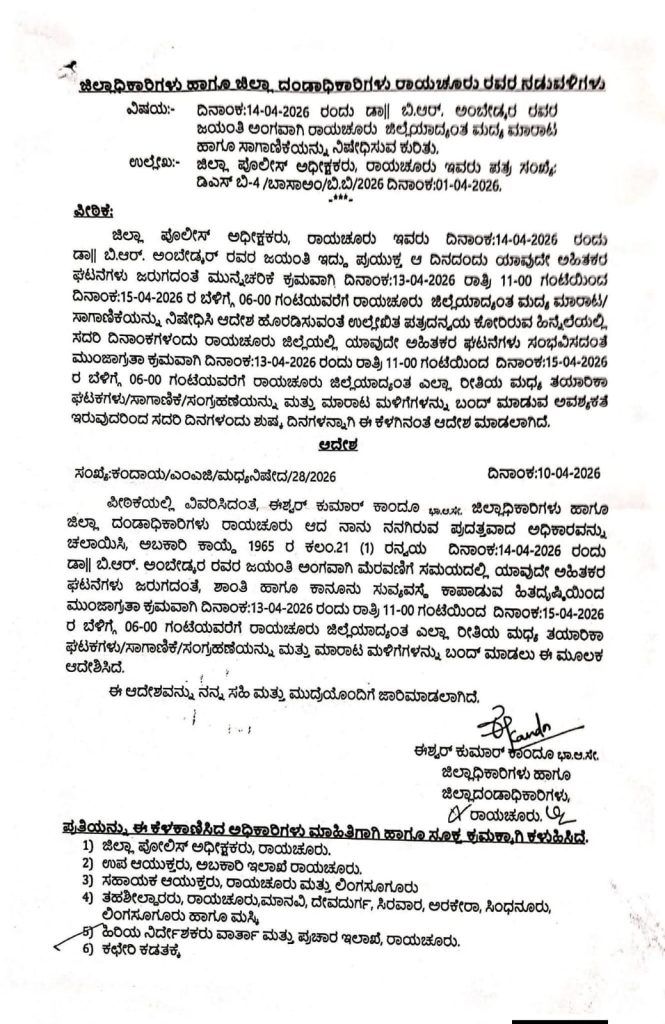 ಡಾ. ಬಿ.ಆರ್. ಅಂಬೇಡ್ಕರ್ ಅವರ ಜಯಂತಿ ಪ್ರಯುಕ್ತ ಮುನ್ನೆಚ್ಚರಿಕೆ ಕ್ರಮವಾಗಿ ರಾಯಚೂರು ಜಿಲ್ಲಾದ್ಯಂತ ಮದ್ಯ ಮಾರಾಟವನ್ನು ನಿಷೇಧಿಸಿ ಜಿಲ್ಲಾಧಿಕಾರಿ ಈಶ್ವರ್ ಕುಮಾರ್ ಕಾಂದೂ ಅವರು ಆದೇಶ ಹೊರಡಿಸಿದ್ದಾರೆ.