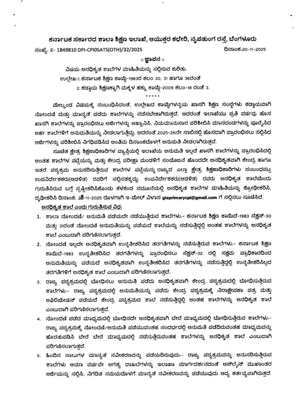 ಸೂಚಿತ ಕ್ಷೇತ್ರ ಶಿಕ್ಷಣಾಧಿಕಾರಿಗಳ ವ್ಯಾಪ್ತಿಯಲ್ಲಿ ಇಲಾಖೆಯ ಅನುಮತಿ ಇಲ್ಲದೆ ಖಾಸಗಿ ಶಾಲೆಗಳನ್ನು ಪ್ರಾರಂಭಿಸಿದಲ್ಲಿ ಅಂತಹ ಶಾಲೆಗಳ ಪಟ್ಟಿಯನ್ನು ಮತ್ತು ಕೇಂದ್ರ ಪರೀಕ್ಷಾ ಮಂಡಳಿಗೆ ಸಂಯೋಜನೆ ಹೊಂದದೇ ಅನಧಿಕೃತವಾಗಿ ಕೇಂದ್ರ ಹಾಗೂ ಇತರೆ ಪಠ್ಯಕ್ರಮ ಅನುಸರಿಸುತ್ತಿರುವ ಶಾಲೆಗಳ ಪಟ್ಟಿಯನ್ನು ರಾಜ್ಯದ ಎಲ್ಲಾ ಕ್ಷೇತ್ರ ಶಿಕ್ಷಣಾಧಿಕಾರಿಗಳು ಸಂಬಂಧಪಟ್ಟ ಉಪನಿರ್ದೇಶಕರು(ಆಡಳಿತ) ರವರಿಗೆ ಸಲ್ಲಿಸತಕ್ಕದ್ದು, ಉಪನಿರ್ದೇಶಕರು(ಆಡಳಿತ) ರವರು ಅನಧಿಕೃತ ಶಾಲೆಯೆಂದು ಗುರುತಿಸಿರುವ ಬಗ್ಗೆ ಸ್ಪಷ್ಟಿಕರಿಸಿಕೊಂಡು ಕೆಳಕಂಡ ನಮೂನೆಯಲ್ಲಿ ಅನಧಿಕೃತ ಶಾಲೆಗಳ ಮಾಹಿತಿಯನ್ನು ಕ್ರೋಢೀಕರಿಸಿ, ದೃಢೀಕರಿಸಿ ದಿನಾಂಕ: 28-11-2025 ರೊಳಗಾಗಿ ಇ-ಮೇಲ್ ವಿಳಾಸ giaprimarycpi@gmail.com ಗೆ ಸಲ್ಲಿಸಲು ಸೂಚಿಸಿದೆ.