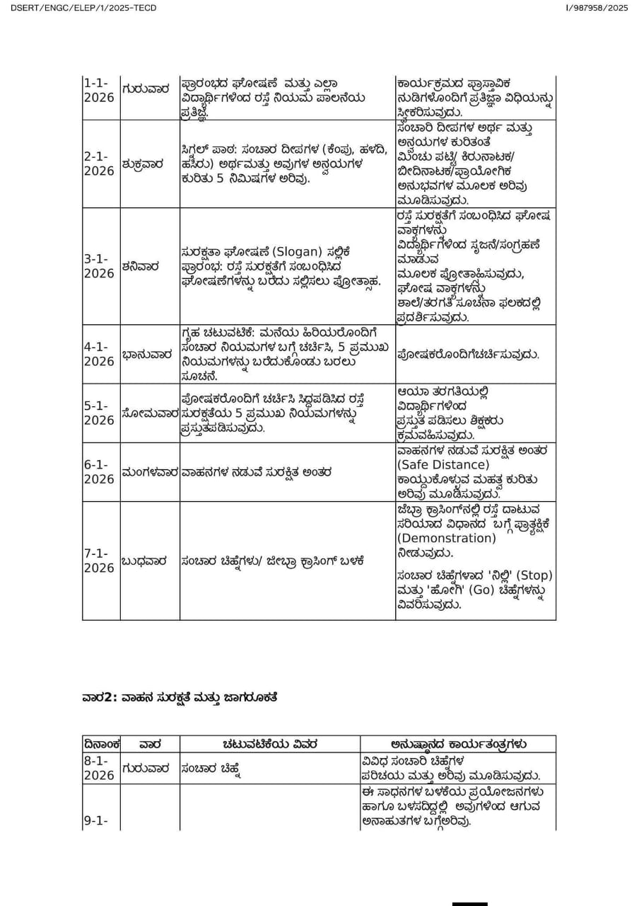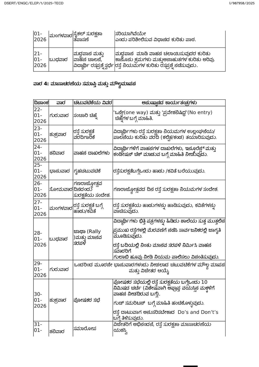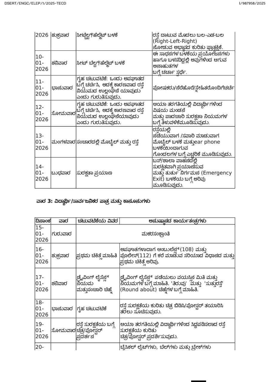 ಜನವರಿ ತಿಂಗಳ ರಸ್ತೆ ಸುರಕ್ಷತೆ ಮಾಸಾಚರಣೆಯ ದಿನವಾರು ಚಟುವಟಿಕೆಗಳು (ಪ್ರತಿ ಚಟುವಟಿಕೆಯು 10 ರಿಂದ 15 ನಿಮಿಷಗಳ ಕಾಲಾವಧಿಗೆ ಸೀಮಿತಗೊಳಿಸಲಾಗಿದೆ).