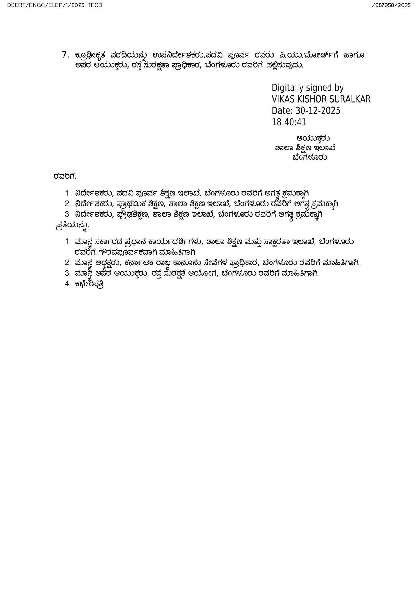 ಶಿಕ್ಷಣ ಇಲಾಖೆಯು ಶಾಲಾ ಮಕ್ಕಳಲ್ಲಿ ರಸ್ತೆ ಸುರಕ್ಷತಾ ಸಂಸ್ಕೃತಿಯನ್ನು ಬೆಳೆಸಲು, ಪ್ರಾಯೋಗಿಕ ಅಧಯನದ ಮೂಲಕ ನಿಯಮಪಾಲನೆಯ ಮಹತ್ತವನ್ನು ಮನವರಿಕೆ ಮಾಡಲು ಮತ್ತು ಸಮಗ್ರ ಸಮಾಜದಲ್ಲಿ ರಸ್ತೆ ಶಿಸ್ತು ಹೆಚ್ಚಿಸಲು ಈ ಅಭಿಯಾನವನ್ನು ಬಲವಾಗಿ ಬೆಂಬಲಿಸುತ್ತದೆ. ಉಲ್ಲೇಖ[1]ರ ದಿನಾಂಕ:06.12.20258 ಸಭೆಯಲ್ಲಿ ಚರ್ಚಿಸಿ ಸಮಿತಿಯು ಸೂಚಿಸಿದ ಅಂಶಗಳನ್ವಯ ರಾಜ್ಯದ ಎಲ್ಲಾ ಶಾಲೆಗಳು ಮತ್ತು ಪದವಿಪೂರ್ವ ಕಾಲೇಜು ವಿದ್ಯಾರ್ಥಿಗಳಲ್ಲಿ ರಸ್ತೆ ಸುರಕ್ಷತೆಯ ಬಗ್ಗೆ ಜಾಗೃತಿ ಮೂಡಿಸಲು ಜನವರಿ 1 ರಿಂದ ಜನವರಿ 31, 2026 ರವರೆಗೆ ಒಂದುತಿಂಗಳ ಕಾಲ “ರಸ್ತೆ ಸುರಕ್ಷತಾ ಮಾಸಾಚರಣೆ” ಯನ್ನು ಹಮ್ಮಿಕೊಳ್ಳಲು ತೀರ್ಮಾನಿಸಲಾಗಿದೆ. ಈ ಮಾಸಾಚರಣೆಯಲ್ಲಿನ ಚಟುವಟಿಕೆಗಳನ್ನು ವಿದ್ಯಾರ್ಥಿಗಳ ದಿನನಿತ್ತದ ಬೋಧನಾ ಪ್ರಕ್ರಿಯೆಗೆ ಯಾವುದೇ ತೊಂದರೆಯಾಗದಂತೆ, ಸರಳವಾಗಿ ನಡೆಸಲು ಸೂಚಿಸಲಾಗಿದೆ. ಯಶಸ್ವಿ ಅನುಷ್ಠಾನಕ್ಕಾಗಿ ಪ್ರತಿದಿನದ ಚಟುವಟಿಕೆ ಮತ್ತು ಅನುಷ್ಠಾನ ಕಾರ್ಯತಂತ್ರಗಳನ್ನು ಸ್ಪಷ್ಟಪಡಿಸಲಾಗಿದೆ. ಸಂಸ್ಥೆಯ ಮುಖ್ಯಸ್ಥರು, ಶಿಕ್ಷಕರು ಮತ್ತು ಸಿಬ್ಬಂದಿವರ್ಗದವರು ಈ ಚಟುವೆಟಿಕೆಗಳನ್ನು ಜವಾಬ್ದಾರಿಯತವಾಗಿ ಮತ್ತು ಕಡ್ಡಾಯವಾಗಿ ನಡೆಸಲು ಅಗತ್ಯ ಕ್ರಮಗಳನ್ನು ಕೈಗೊಳ್ಳಲು ಸೂಚಿಸಿದೆ.