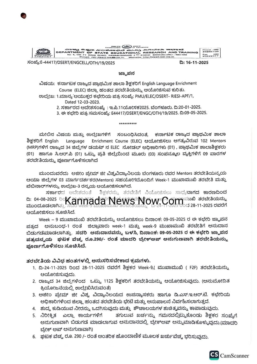 ಬೆಂಗಳೂರು : ಕರ್ನಾಟಕ ರಾಜ್ಯದ ಪ್ರಾಥಮಿಕ ಶಾಲಾ ಶಿಕ್ಷಕರಿಗೆ English Language Enrichment Course (ELEC) ಜಿಲ್ಲಾ ಹಂತದ ತರಬೇತಿಯನ್ನು ಆಯೋಜಿಸುವ ಕುರಿತು ಶಿಕ್ಷಣ ಇಲಾಖೆ ಮಹತ್ವದ ಆದೇಶ ಹೊರಡಿಸಿದೆ.