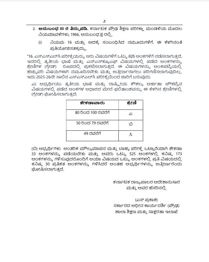 ಈ ಮೊದಲು ಎಸ್ಎಸ್ಎಲ್ಸಿ ಪರೀಕ್ಷೆಯು ಒಟ್ಟು 625 ಅಂಕಗಳಿಗೆ ನಡೆಯುತ್ತಿತ್ತು. ಆದರೆ, ಹೊಸ ನಿಯಮದ ಪ್ರಕಾರ ತೃತೀಯ ಭಾಷೆ (Third Language) ವಿಷಯಕ್ಕೆ ನೀಡಲಾಗುತ್ತಿದ್ದ 100 ಅಂಕಗಳನ್ನು ತೆಗೆದುಹಾಕಲಾಗಿದೆ. ಇದರ ಬದಲಾಗಿ ತೃತೀಯ ಭಾಷೆಯಲ್ಲಿ ಕೇವಲ ‘ಗ್ರೇಡ್’ (Grade System) ನೀಡಲು ತೀರ್ಮಾನಿಸಲಾಗಿದೆ. ಹೀಗಾಗಿ, ಇನ್ಮುಂದೆ ಫಲಿತಾಂಶವನ್ನು ಒಟ್ಟು 525 ಅಂಕಗಳಿಗೆ ಪರಿಗಣಿಸಲಾಗುತ್ತದೆ.