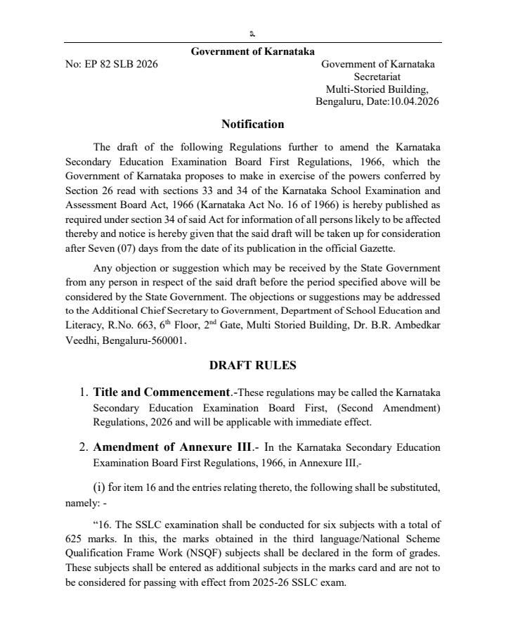 ಬೆಂಗಳೂರು: ರಾಜ್ಯದ ಎಸ್ಎಸ್ಎಲ್ಸಿ (SSLC) ವಿದ್ಯಾರ್ಥಿಗಳಿಗೆ ಶಿಕ್ಷಣ ಇಲಾಖೆಯು ಮಹತ್ವದ ಸುದ್ದಿಯೊಂದನ್ನು ನೀಡಿದೆ. ಇನ್ನು ಮುಂದೆ ಎಸ್ಎಸ್ಎಲ್ಸಿ ಪರೀಕ್ಷೆಯ ಒಟ್ಟು ಅಂಕಗಳಲ್ಲಿ ಬದಲಾವಣೆಯಾಗಲಿದ್ದು, ಈ ಕುರಿತು ಶಿಕ್ಷಣ ಇಲಾಖೆಯು ಅಧಿಕೃತ ಕರಡು ಅಧಿಸೂಚನೆಯನ್ನು ಹೊರಡಿಸಿದೆ.