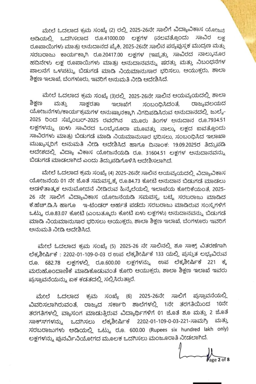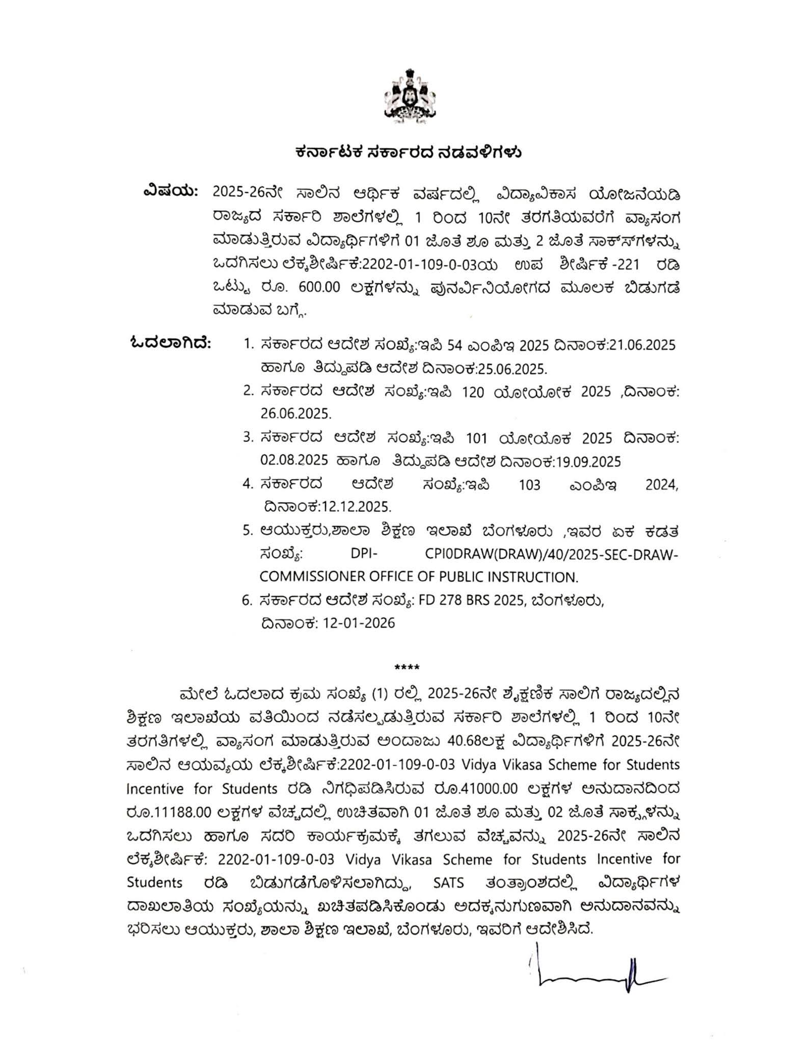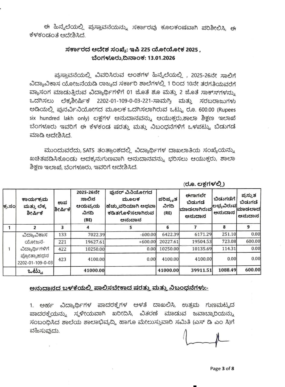 ಮೇಲೆ ಓದಲಾದ ಕ್ರಮ ಸಂಖ್ಯೆ (1) ರಲ್ಲಿ 2025-26ನೇ ಶೈಕ್ಷಣಿಕ ಸಾಲಿಗೆ ರಾಜ್ಯದಲ್ಲಿನ ಶಿಕ್ಷಣ ಇಲಾಖೆಯ ವತಿಯಿಂದ ನಡೆಸಲ್ಪಡುತ್ತಿರುವ ಸರ್ಕಾರಿ ಶಾಲೆಗಳಲ್ಲಿ 1 ರಿಂದ 10ನೇ ತರಗತಿಗಳಲ್ಲಿ ವ್ಯಾಸಂಗ ಮಾಡುತ್ತಿರುವ ಅಂದಾಜು 40.68ಲಕ್ಷ ವಿದ್ಯಾರ್ಥಿಗಳಿಗೆ 2025-26ನೇ ປໍ ຜ :2202-01-109-0-03 Vidya Vikasa Scheme for Students Incentive for Students ರಡಿ ನಿಗಧಿಪಡಿಸಿರುವ ರೂ.41000.00 ಲಕ್ಷಗಳ ಅನುದಾನದಿಂದ ರೂ.11188.00 ಲಕ್ಷಗಳ ವೆಚ್ಚದಲ್ಲಿ ಉಚಿತವಾಗಿ 01 ಜೊತೆ ಶೂ ಮತ್ತು 02 ಜೊತೆ ಸಾಕ್ಷ್ಯಳನ್ನು ಒದಗಿಸಲು ಹಾಗೂ ಸದರಿ ಕಾರ್ಯಕ್ರಮಕ್ಕೆ ತಗಲುವ ವೆಚ್ಚವನ್ನು 2025-26ನೇ ಸಾಲಿನ : 2202-01-109-0-03 Vidya Vikasa Scheme for Students Incentive for Students ರಡಿ ಬಿಡುಗಡೆಗೊಳಿಸಲಾಗಿದ್ದು, SATS ತಂತ್ರಾಂಶದಲ್ಲಿ ವಿದ್ಯಾರ್ಥಿಗಳ ದಾಖಲಾತಿಯ ಸಂಖ್ಯೆಯನ್ನು ಖಚಿತಪಡಿಸಿಕೊಂಡು ಅದಕ್ಕನುಗುಣವಾಗಿ ಅನುದಾನವನ್ನು ಭರಿಸಲು ಆಯುಕ್ತರು, ಶಾಲಾ ಶಿಕ್ಷಣ ಇಲಾಖೆ, ಬೆಂಗಳೂರು, ಇವರಿಗೆ ಆದೇಶಿಸಿದೆ.