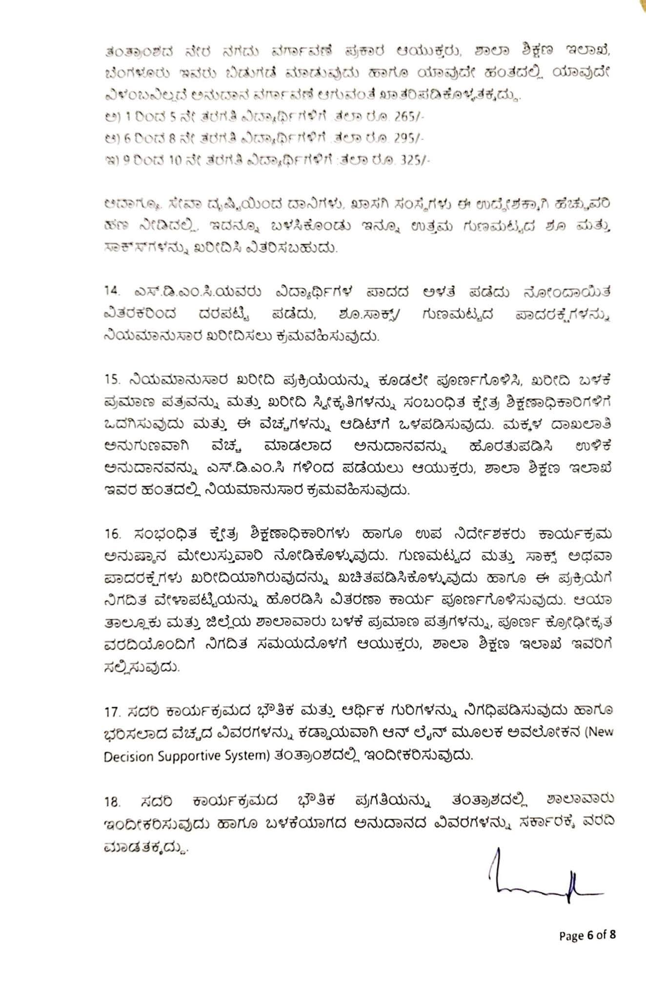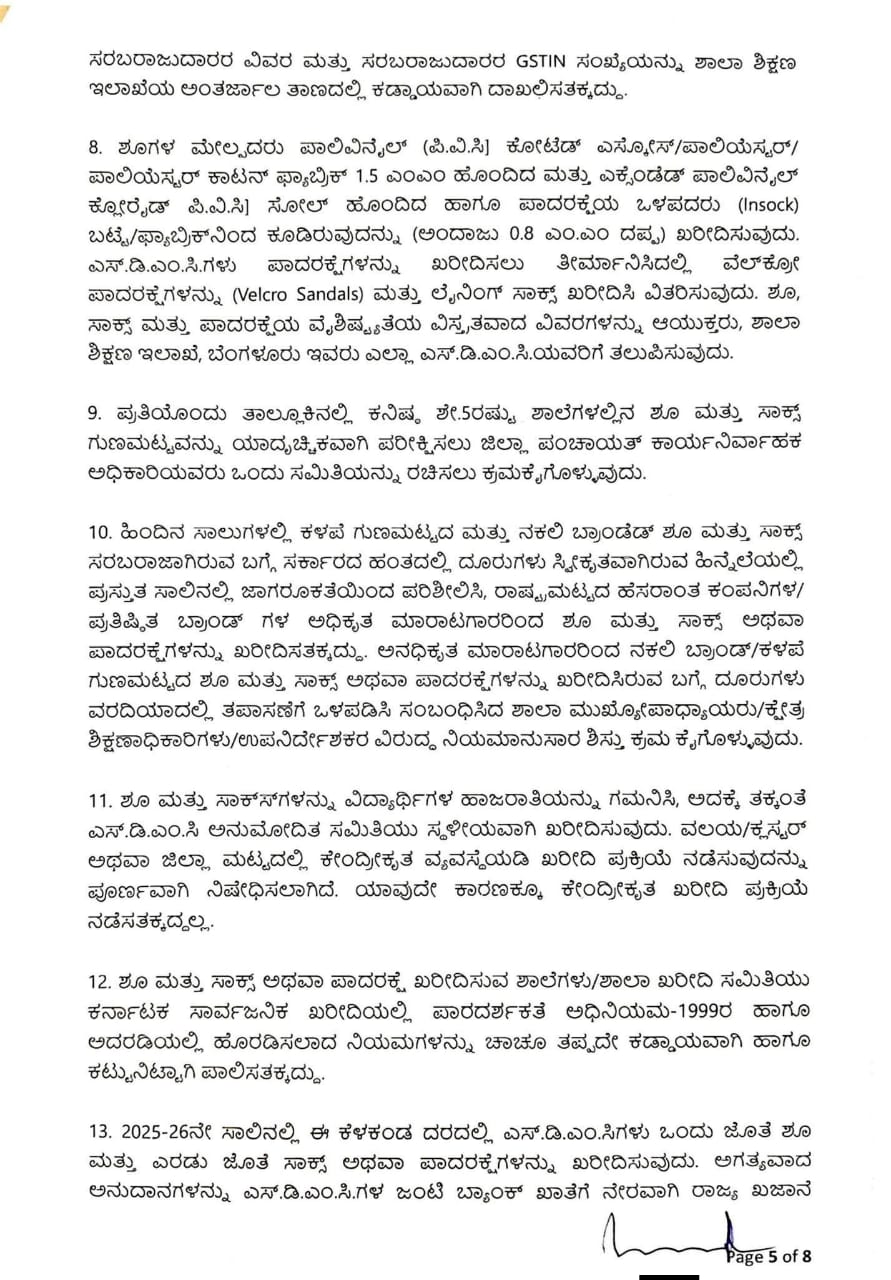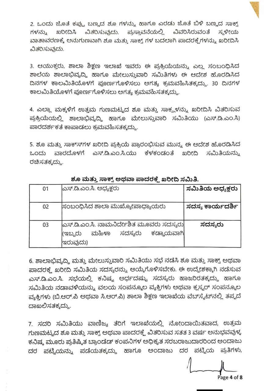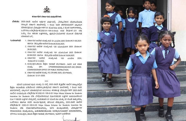 ಮೇಲೆ ಓದಲಾದ ಕ್ರಮ ಸಂಖ್ಯೆ (1) ರಲ್ಲಿ 2025-26ನೇ ಶೈಕ್ಷಣಿಕ ಸಾಲಿಗೆ ರಾಜ್ಯದಲ್ಲಿನ ಶಿಕ್ಷಣ ಇಲಾಖೆಯ ವತಿಯಿಂದ ನಡೆಸಲ್ಪಡುತ್ತಿರುವ ಸರ್ಕಾರಿ ಶಾಲೆಗಳಲ್ಲಿ 1 ರಿಂದ 10ನೇ ತರಗತಿಗಳಲ್ಲಿ ವ್ಯಾಸಂಗ ಮಾಡುತ್ತಿರುವ ಅಂದಾಜು 40.68ಲಕ್ಷ ವಿದ್ಯಾರ್ಥಿಗಳಿಗೆ 2025-26ನೇ ປໍ ຜ :2202-01-109-0-03 Vidya Vikasa Scheme for Students Incentive for Students ರಡಿ ನಿಗಧಿಪಡಿಸಿರುವ ರೂ.41000.00 ಲಕ್ಷಗಳ ಅನುದಾನದಿಂದ ರೂ.11188.00 ಲಕ್ಷಗಳ ವೆಚ್ಚದಲ್ಲಿ ಉಚಿತವಾಗಿ 01 ಜೊತೆ ಶೂ ಮತ್ತು 02 ಜೊತೆ ಸಾಕ್ಷ್ಯಳನ್ನು ಒದಗಿಸಲು ಹಾಗೂ ಸದರಿ ಕಾರ್ಯಕ್ರಮಕ್ಕೆ ತಗಲುವ ವೆಚ್ಚವನ್ನು 2025-26ನೇ ಸಾಲಿನ : 2202-01-109-0-03 Vidya Vikasa Scheme for Students Incentive for Students ರಡಿ ಬಿಡುಗಡೆಗೊಳಿಸಲಾಗಿದ್ದು, SATS ತಂತ್ರಾಂಶದಲ್ಲಿ ವಿದ್ಯಾರ್ಥಿಗಳ ದಾಖಲಾತಿಯ ಸಂಖ್ಯೆಯನ್ನು ಖಚಿತಪಡಿಸಿಕೊಂಡು ಅದಕ್ಕನುಗುಣವಾಗಿ ಅನುದಾನವನ್ನು ಭರಿಸಲು ಆಯುಕ್ತರು, ಶಾಲಾ ಶಿಕ್ಷಣ ಇಲಾಖೆ, ಬೆಂಗಳೂರು, ಇವರಿಗೆ ಆದೇಶಿಸಿದೆ.