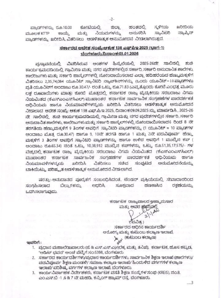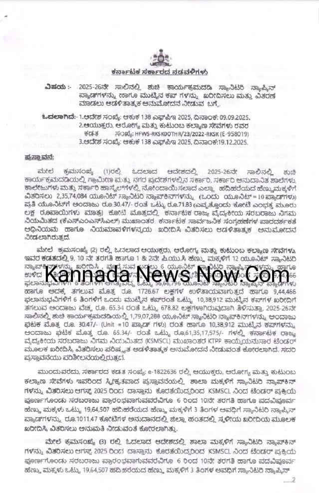 ಮುಂದುವರೆದು, ಸರ್ಕಾರದ ಕಡತ ಸಂಖ್ಯೆ: e-1822636 ರಲ್ಲಿ ಆಯುಕ್ತರು, ಆರೋಗ್ಯ ಮತ್ತು ಕುಟುಂಬ ಕಲ್ಯಾಣ ಸೇವೆಗಳು ಇವರಿಂದ ಸ್ವೀಕೃತವಾದ ಪ್ರಸ್ತಾವನೆಯಲ್ಲಿ ಶಾಲಾ ಮಕ್ಕಳಿಗೆ ಸ್ಯಾನಿಟರಿ ನ್ಯಾಪ್ಕಿನ್ ಗಳನ್ನು ವಿತರಿಸಲು ಆಗಸ್ಟ್ 2025 ರಿಂದ ದಾಸ್ತಾನು ಕೊರತೆಯಿದ್ದರಿಂದ KSMSCL ನಿಂದ ಟೆಂಡರ್ ಪ್ರಕ್ರಿಯೆ ಪೂರ್ಣಗೊಂಡು ಸರಬರಾಜು ಪ್ರಾರಂಭವಾಗುವವರೆವಿಗೂ 6 ರಿಂದ 10ನೇ ತರಗತಿ ಹಾಗೂ ಪದವಿಪೂರ್ವ ಹೆಣ್ಣು ಮಕ್ಕಳು ಒಟ್ಟು 19,64,507 ಹದಿಹರೆಯದ ಹೆಣ್ಣು ಮಕ್ಕಳಿಗೆ 3 ತಿಂಗಳ ಅವಧಿಗೆ ಸ್ಯಾನಿಟರಿ ನ್ಯಾಪ್ಟಿನ್ ಪ್ಯಾಡ್ಗಳನ್ನು ರೂ.1011.47 ಕೋಟಿಗಳ ಅನುದಾನದಲ್ಲಿ ಜಿಲ್ಲಾ ಹಂತದಲ್ಲಿ ಸ್ಥಳೀಯ ಖರೀದಿಯ ಮೂಲಕ ಖರೀದಿಸಿ, ವಿತರಿಸಲು ಅನುಮತಿ ನೀಡುವಂತೆ ಕೋರಲಾಗಿತ್ತು.