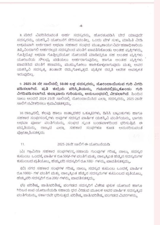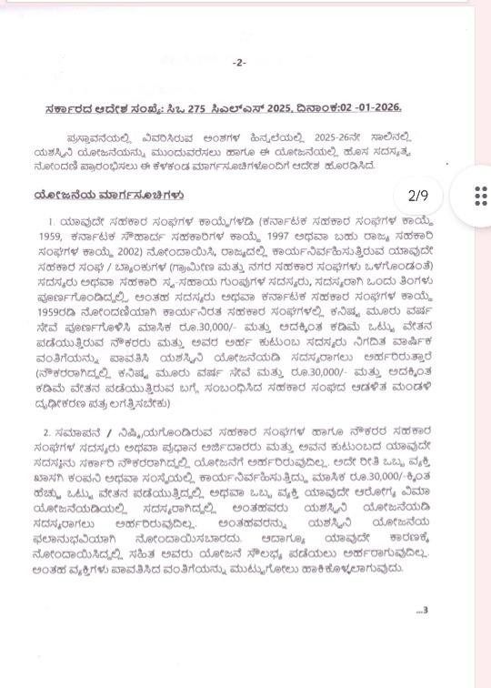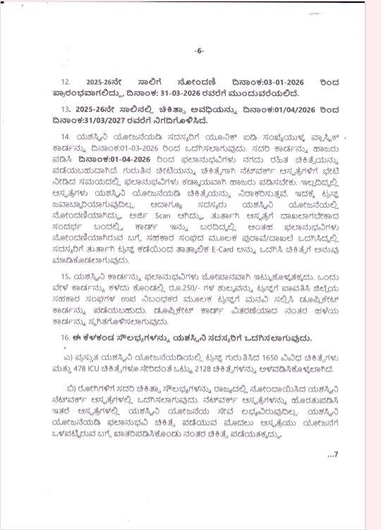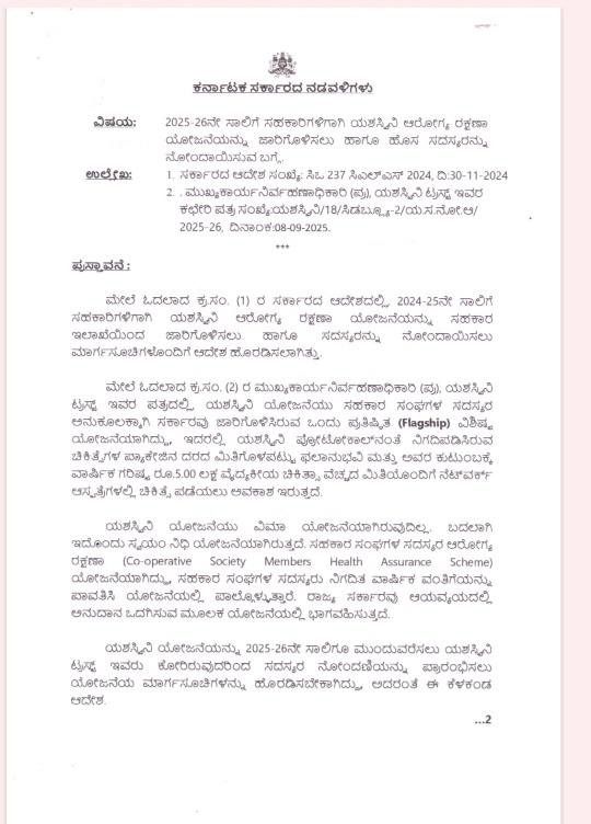 ಈ ಕುರಿತಂತೆ ಸಹಕಾರ ಇಲಾಖೆಯ ಸರ್ಕಾರದ ಅಧೀನ ಕಾರ್ಯದರ್ಶಿ ನಡವಳಿಯನ್ನು ಹೊರಡಿಸಿದ್ದಾರೆ. ಅದರಲ್ಲಿ 2024-25ನೇ ಸಾಲಿಗೆ ಸಹಕಾರಿಗಳಿಗಾಗಿ ಯಶಸ್ವಿನಿ ಆರೋಗ್ಯ ರಕ್ಷಣಾ ಯೋಜನೆಯನ್ನು ಸಹಕಾರ ಇಲಾಖೆಯಿಂದ ಜಾರಿಗೊಳಿಸಲು ಹಾಗೂ ಸದಸ್ಯರನ್ನು ನೋಂದಾಯಿಸಲು ಮಾರ್ಗಸೂಚಿಗಳೊಂದಿಗೆ ಆದೇಶ ಹೊರಡಿಸಲಾಗಿತ್ತು ಎಂದಿದ್ದಾರೆ.