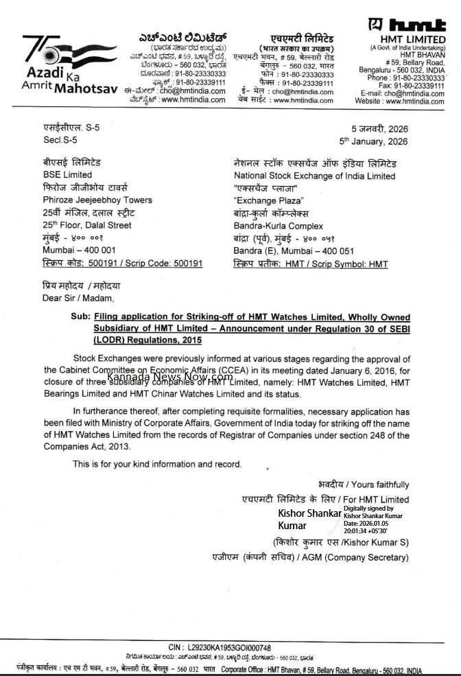 SEBI (LODR) ನಿಯಮಗಳು, 2015 ರ ನಿಯಮ 30 ರ ಅಡಿಯಲ್ಲಿ HMT ಲಿಮಿಟೆಡ್ನ ಸಂಪೂರ್ಣ ಸ್ವಾಮ್ಯದ ಅಂಗಸಂಸ್ಥೆಯಾದ HMT ವಾಚಸ್ ಲಿಮಿಟೆಡ್ ಅನ್ನು ವಜಾಗೊಳಿಸಲು ಅರ್ಜಿ ಸಲ್ಲಿಸುವುದು. HMT ಲಿಮಿಟೆಡ್ನ ಮೂರು ಅಂಗಸಂಸ್ಥೆ ಕಂಪನಿಗಳಾದ HMT ವಾಚಸ್ ಲಿಮಿಟೆಡ್, HMT ಬೇರಿಂಗ್ಸ್ ಲಿಮಿಟೆಡ್ ಮತ್ತು HMT ಚಿನಾರ್ ವಾಚಸ್ ಲಿಮಿಟೆಡ್ ಅನ್ನು ಮುಚ್ಚಲು ಆರ್ಥಿಕ ವ್ಯವಹಾರಗಳ ಸಂಪುಟ ಸಮಿತಿ (CCEA) ಜನವರಿ 6, 2016 ರಂದು ನಡೆಸಿದ ಸಭೆಯಲ್ಲಿ ಅನುಮೋದನೆ ನೀಡಿದ್ದು, ಅದರ ಸ್ಥಿತಿಗತಿ ಮತ್ತು ಅದರ ಬಗ್ಗೆ ಷೇರು ವಿನಿಮಯ ಕೇಂದ್ರಗಳಿಗೆ ವಿವಿಧ ಹಂತಗಳಲ್ಲಿ ತಿಳಿಸಲಾಗಿತ್ತು.