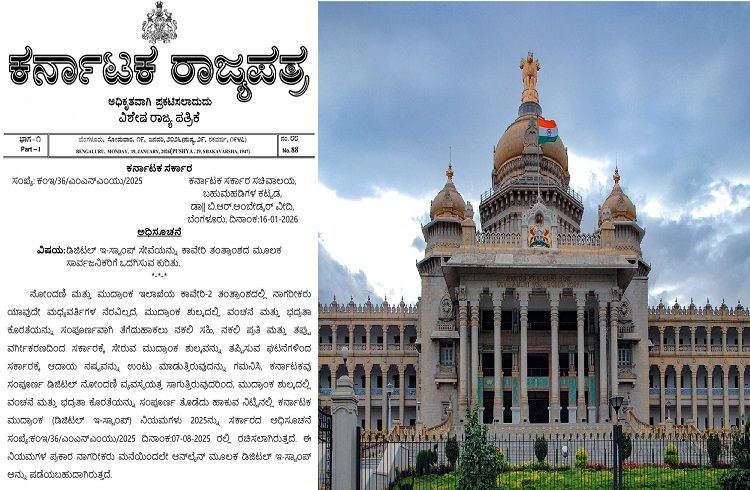 ರಾಜ್ಯ ಸರ್ಕಾರವು ಕರ್ನಾಟಕ ಮುದ್ರಾಂಕ (ಡಿಜಿಟಲ್ ಇ-ಸ್ಟಾಂಪ್) ನಿಯಮಗಳು 2025ರ ನಿಯಮ (3) ರ ಪ್ರಕಾರ ನೋಂದಣಿ ಮತ್ತು ಮುದ್ರಾಂಕ ಇಲಾಖೆಯ ಕಾವೇರಿ-2 ತಂತ್ರಾಂಶವನ್ನು “ಡಿಜಿಟಲ್ ಇ-ಸ್ಟ್ಯಾಂಪ್ ಅಪ್ಲಿಕೇಶನ್”ಎಂದು ಅಧಿಸೂಚಿಸಿ ಹೊರಡಿಸಲಾಗಿದೆ.