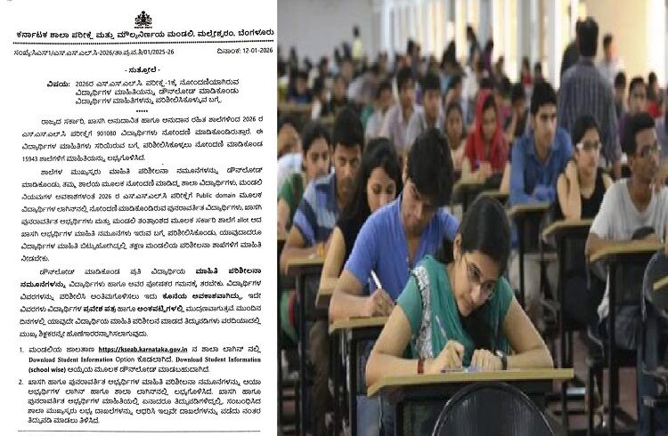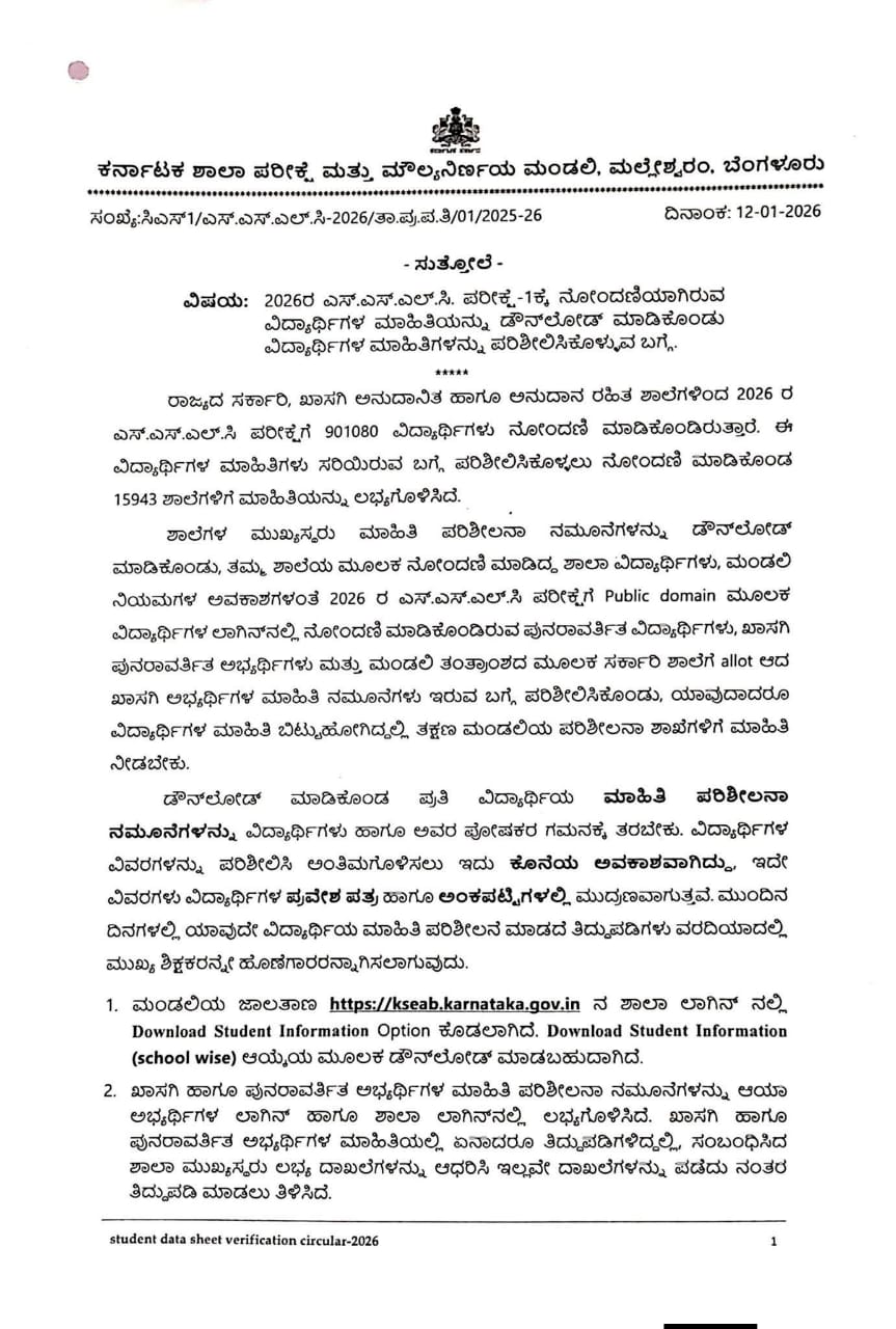 ಬೆಂಗಳೂರು : 2026ರ ಎಸ್.ಎಸ್.ಎಲ್.ಸಿ. ಪರೀಕ್ಷೆ-1ಕ್ಕೆ ನೋಂದಣಿಯಾಗಿರುವ ವಿದ್ಯಾರ್ಥಿಗಳ ಮಾಹಿತಿಯನ್ನು ಡೌನ್ಲೋಡ್ ಮಾಡಿಕೊಂಡು ವಿದ್ಯಾರ್ಥಿಗಳ ಮಾಹಿತಿಗಳನ್ನು ಪರಿಶೀಲಿಸಿಕೊಳ್ಳುವ ಬಗ್ಗೆ ಕರ್ನಾಟಕ ಶಾಲಾ ಪರೀಕ್ಷೆ ಮತ್ತು ಮೌಲ್ಯನಿರ್ಣಯ ಮಂಡಲಿ ಮಹತ್ವದ ಆದೇಶ ಹೊರಡಿಸಿದೆ.