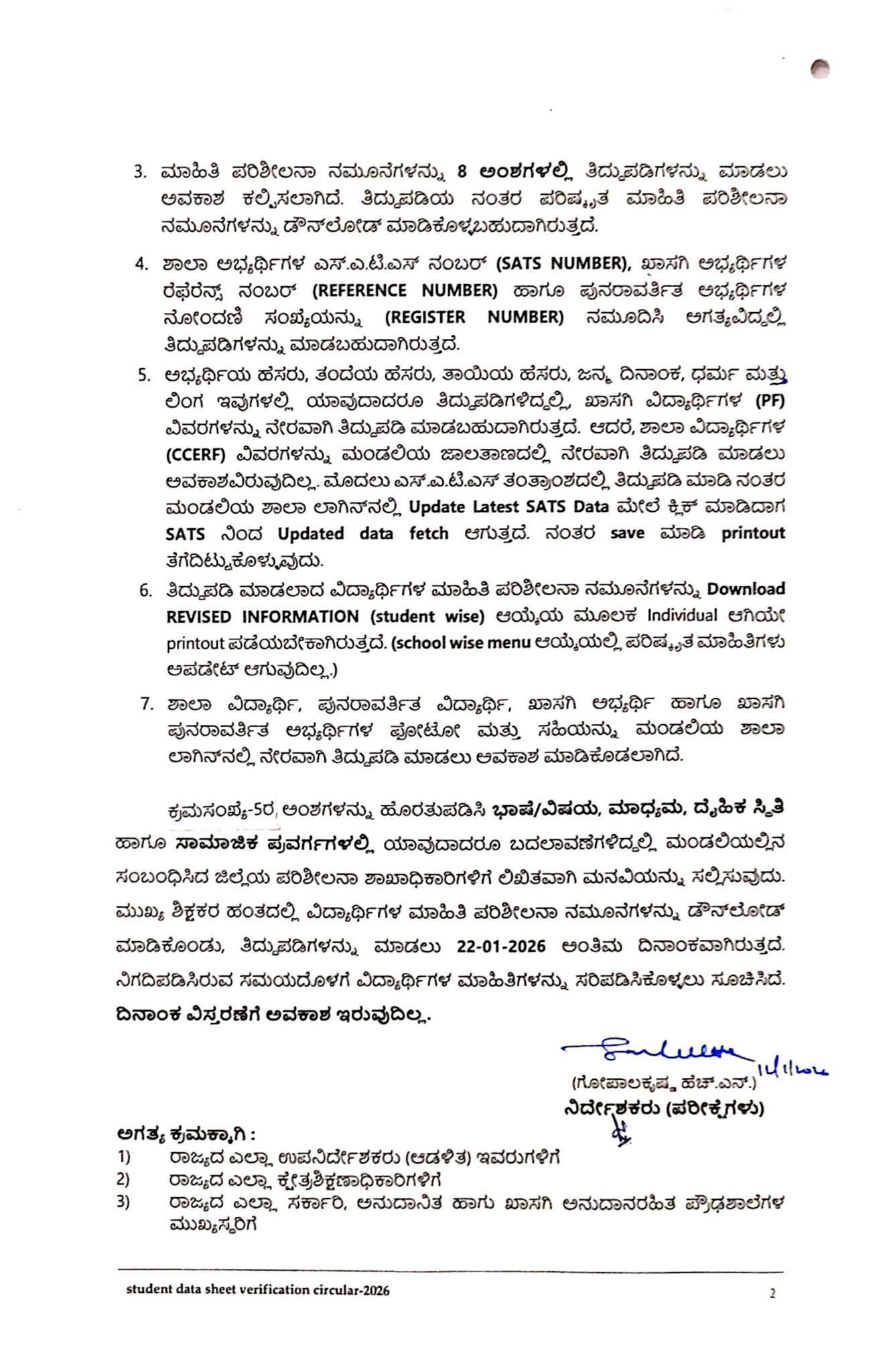 ಡೌನ್ಲೋಡ್ ಮಾಡಿಕೊಂಡ ಪ್ರತಿ ವಿದ್ಯಾರ್ಥಿಯ ಮಾಹಿತಿ ಪರಿಶೀಲನಾ ನಮೂನೆಗಳನ್ನು ವಿದ್ಯಾರ್ಥಿಗಳು ಹಾಗೂ ಅವರ ಪೋಷಕರ ಗಮನಕ್ಕೆ ತರಬೇಕು. ವಿದ್ಯಾರ್ಥಿಗಳ ವಿವರಗಳನ್ನು ಪರಿಶೀಲಿಸಿ ಅಂತಿಮಗೊಳಿಸಲು ಇದು ಕೊನೆಯ ಅವಕಾಶವಾಗಿದ್ದು, ಇದೇ ವಿವರಗಳು ವಿದ್ಯಾರ್ಥಿಗಳ ಪ್ರವೇಶ ಪತ್ರ ಹಾಗೂ ಅಂಕಪಟ್ಟಿಗಳಲ್ಲಿ ಮುದ್ರಣವಾಗುತ್ತವೆ. ಮುಂದಿನ ದಿನಗಳಲ್ಲಿ ಯಾವುದೇ ವಿದ್ಯಾರ್ಥಿಯ ಮಾಹಿತಿ ಪರಿಶೀಲನೆ ಮಾಡದೆ ತಿದ್ದುಪಡಿಗಳು ವರದಿಯಾದಲ್ಲಿ ಮುಖ್ಯ ಶಿಕ್ಷಕರನ್ನೇ ಹೊಣೆಗಾರರನ್ನಾಗಿಸಲಾಗುವುದು.