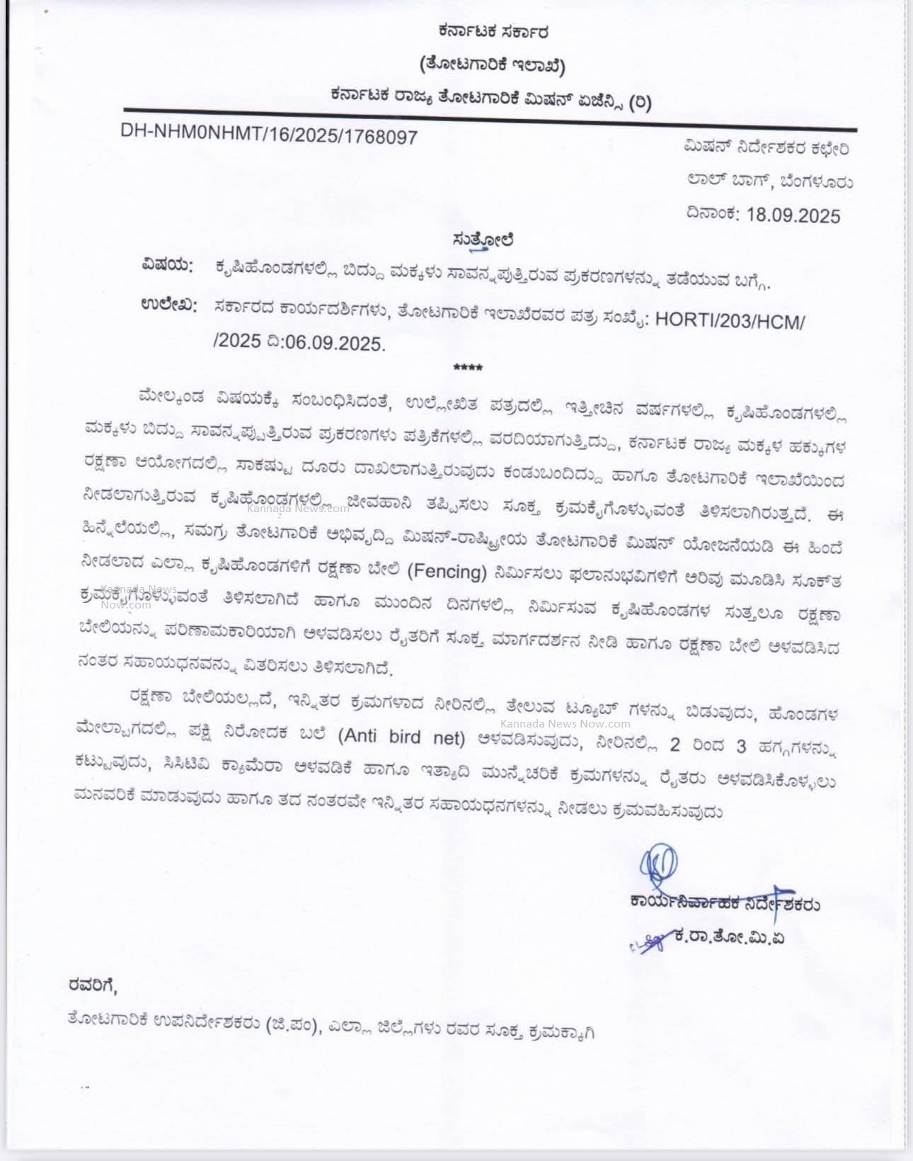 ಮೇಲ್ಕಂಡ ವಿಷಯಕ್ಕೆ ಸಂಬಂಧಿಸಿದಂತೆ ಉಲ್ಲೇಖಿತ ಪತ್ರದಲ್ಲಿ ಇತ್ತೀಚಿನ ವರ್ಷಗಳಲ್ಲಿ ಕೃಷಿಹೊಂಡಗಳಲ್ಲಿ ಮಕ್ಕಳು ಬಿದ್ದು ಸಾವನ್ನಪ್ಪುತ್ತಿರುವ ಪ್ರಕರಣಗಳು ಪತ್ರಿಕೆಗಳಲ್ಲಿ ವರದಿಯಾಗುತ್ತಿದ್ದು, ಕರ್ನಾಟಕ ರಾಜ್ಯ ಮಕ್ಕಳ ಹಕ್ಕುಗಳ ರಕ್ಷಣಾ ಆಯೋಗದಲ್ಲಿ ಸಾಕಷ್ಟು ದೂರು ದಾಖಲಾಗುತ್ತಿರುವುದು ಕಂಡುಬಂದಿದ್ದು ಹಾಗೂ ತೋಟಗಾರಿಕೆ ಇಲಾಖೆಯಿಂದ ನೀಡಲಾಗುತ್ತಿರುವ ಕೃಷಿಹೊಂಡಗಳಲ್ಲಿ ಜೀವಹಾನಿ ತಪ್ಪಿಸಲು ಸೂಕ್ತ ಕ್ರಮಕೈಗೊಳ್ಳುವಂತೆ ತಿಳಿಸಲಾಗಿರುತ್ತದೆ. ಈ ಹಿನ್ನೆಲೆಯಲ್ಲಿ, ಸಮಗ್ರ ತೋಟಗಾರಿಕೆ ಅಭಿವೃದ್ಧಿ ಮಿಷನ್-ರಾಷ್ಟ್ರೀಯ ತೋಟಗಾರಿಕೆ ಮಿಷನ್ ಯೋಜನೆಯಡಿ ಈ ಹಿಂದೆ ನೀಡಲಾದ ಎಲ್ಲಾ ಕೃಷಿಹೊಂಡಗಳಿಗೆ ರಕ್ಷಣಾ ಬೇಲಿ (Fencing) ನಿರ್ಮಿಸಲು ಫಲಾನುಭವಿಗಳಿಗೆ ಅರಿವು ಮೂಡಿಸಿ ಸೂಕ್ತ ಕ್ರಮಕೈಗೊಳ್ಳುವಂತೆ ತಿಳಿಸಲಾಗಿದೆ ಹಾಗೂ ಮುಂದಿನ ದಿನಗಳಲ್ಲಿ ನಿರ್ಮಿಸುವ ಕೃಷಿಹೊಂಡಗಳ ಸುತ್ತಲೂ ರಕ್ಷಣಾ ಬೇಲಿಯನ್ನು ಪರಿಣಾಮಕಾರಿಯಾಗಿ ಅಳವಡಿಸಲು ರೈತರಿಗೆ ಸೂಕ್ತ ಮಾರ್ಗದರ್ಶನ ನೀಡಿ ಹಾಗೂ ರಕ್ಷಣಾ ಬೇಲಿ ಅಳವಡಿಸಿದ ನಂತರ ಸಹಾಯಧನವನ್ನು ವಿತರಿಸಲು ತಿಳಿಸಲಾಗಿದೆ.