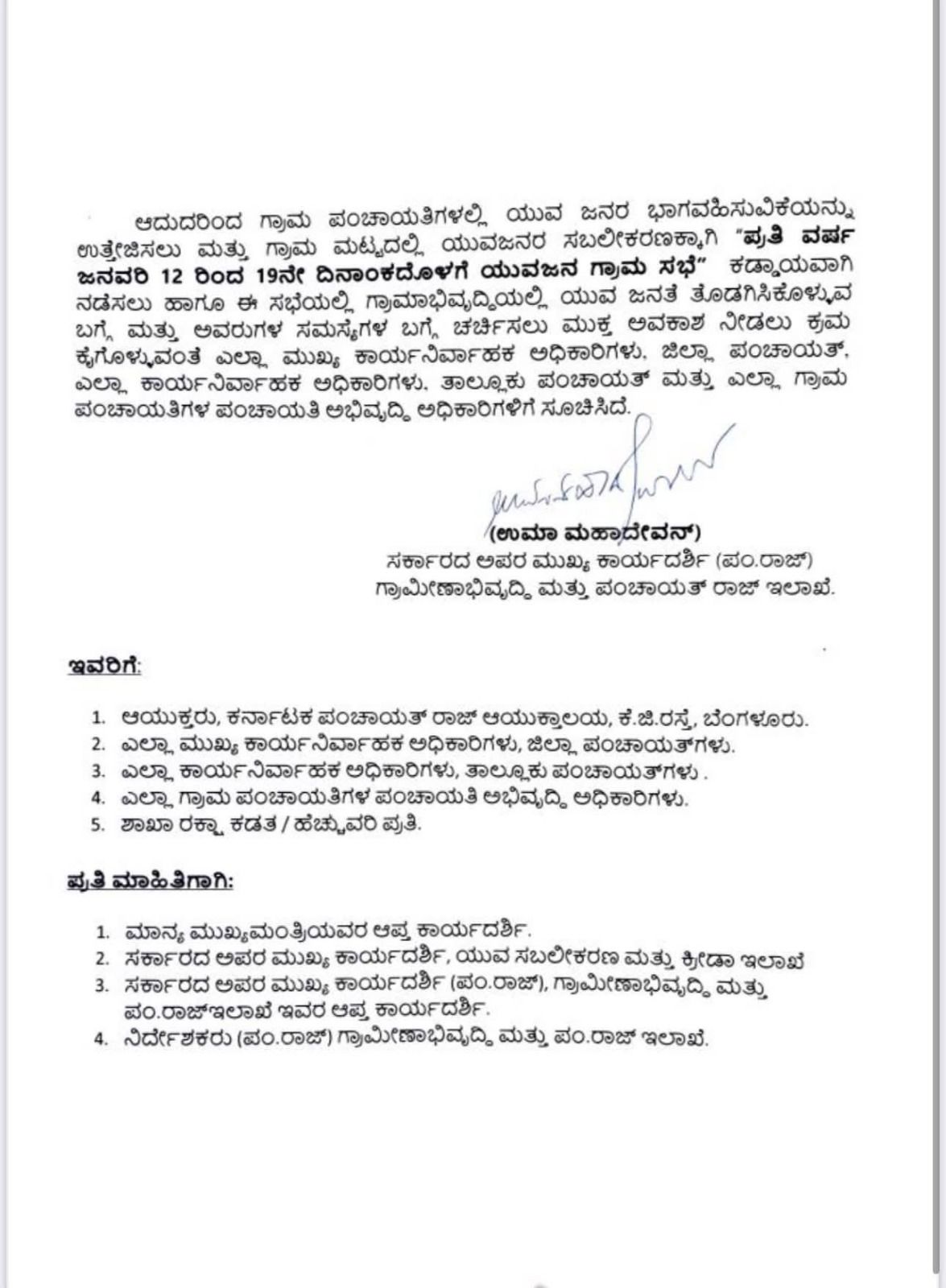 ಆದುದರಿಂದ ಗ್ರಾಮ ಪಂಚಾಯತಿಗಳಲ್ಲಿ ಯುವ ಜನರ ಭಾಗವಹಿಸುವಿಕೆಯನ್ನು ಉತ್ತೇಜಿಸಲು ಮತ್ತು ಗ್ರಾಮ ಮಟ್ಟದಲ್ಲಿ ಯುವಜನರ ಸಬಲೀಕರಣಕ್ಕಾಗಿ “ಪ್ರತಿ ವರ್ಷ ಜನವರಿ 12 ರಿಂದ 19ನೇ ದಿನಾಂಕದೊಳಗೆ ಯುವಜನ ಗ್ರಾಮ ಸಭೆ” ಕಡ್ಡಾಯವಾಗಿ ನಡೆಸಲು ಹಾಗೂ ಈ ಸಭೆಯಲ್ಲಿ ಗ್ರಾಮಾಭಿವೃದ್ಧಿಯಲ್ಲಿ ಯುವ ಜನತೆ ತೊಡಗಿಸಿಕೊಳ್ಳುವ ಬಗ್ಗೆ ಮತ್ತು ಅವರುಗಳ ಸಮಸ್ಯೆಗಳ ಬಗ್ಗೆ ಚರ್ಚಿಸಲು ಮುಕ್ತ ಅವಕಾಶ ನೀಡಲು ಕ್ರಮ ಕೈಗೊಳ್ಳುವಂತೆ ಎಲ್ಲಾ ಮುಖ್ಯ ಕಾರ್ಯನಿರ್ವಾಹಕ ಅಧಿಕಾರಿಗಳು, ಜಿಲ್ಲಾ ಪಂಚಾಯತ್, ಎಲ್ಲಾ ಕಾರ್ಯನಿರ್ವಾಹಕ ಅಧಿಕಾರಿಗಳು, ತಾಲ್ಲೂಕು ಪಂಚಾಯತ್ ಮತ್ತು ಎಲ್ಲಾ ಗ್ರಾಮ ಪಂಚಾಯತಿಗಳ ಪಂಚಾಯತಿ ಅಭಿವೃದ್ಧಿ ಅಧಿಕಾರಿಗಳಿಗೆ ಸೂಚಿಸಿದೆ.