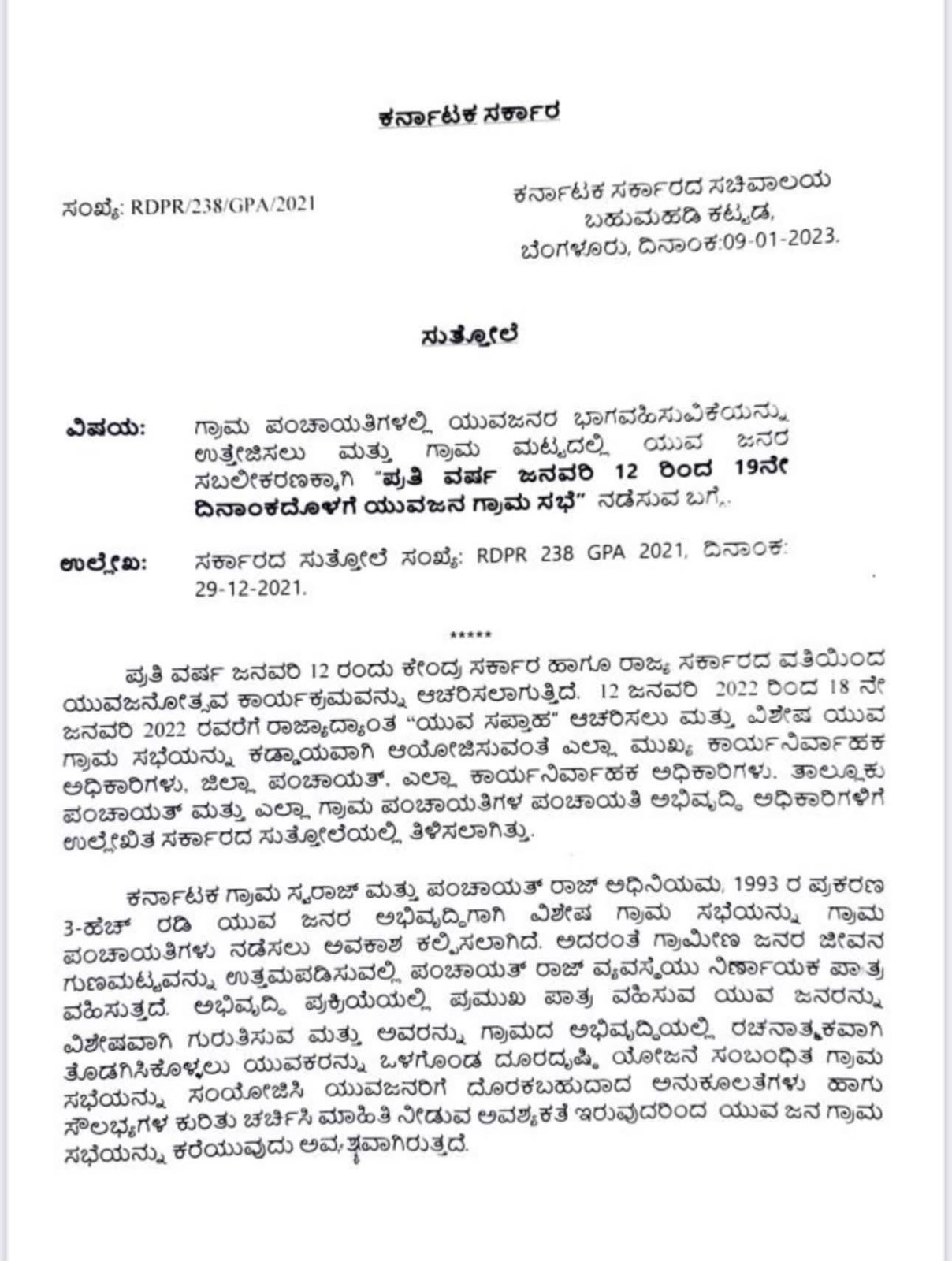 ಪ್ರತಿ ವರ್ಷ ಜನವರಿ 12 ರಂದು ಕೇಂದ್ರ ಸರ್ಕಾರ ಹಾಗೂ ರಾಜ್ಯ ಸರ್ಕಾರದ ವತಿಯಿಂದ ಯುವಜನೋತ್ಸವ ಕಾರ್ಯಕ್ರಮವನ್ನು ಆಚರಿಸಲಾಗುತ್ತಿದೆ. 12 ಜನವರಿ 2022 ರಿಂದ 18 ನೇ ಜನವರಿ 2022 ರವರೆಗೆ ರಾಜ್ಯಾದ್ಯಾಂತ “ಯುವ ಸಪ್ತಾಹ” ಆಚರಿಸಲು ಮತ್ತು ವಿಶೇಷ ಯುವ ಗ್ರಾಮ ಸಭೆಯನ್ನು ಕಡ್ಡಾಯವಾಗಿ ಆಯೋಜಿಸುವಂತೆ ಎಲ್ಲಾ ಮುಖ್ಯ ಕಾರ್ಯನಿರ್ವಾಹಕ ಅಧಿಕಾರಿಗಳು, ಜಿಲ್ಲಾ ಪಂಚಾಯತ್, ಎಲ್ಲಾ ಕಾರ್ಯನಿರ್ವಾಹಕ ಅಧಿಕಾರಿಗಳು. ತಾಲ್ಲೂಕು ಪಂಚಾಯತ್ ಮತ್ತು ಎಲ್ಲಾ ಗ್ರಾಮ ಪಂಚಾಯತಿಗಳ ಪಂಚಾಯತಿ ಅಭಿವೃದ್ಧಿ ಅಧಿಕಾರಿಗಳಿಗೆ ಉಲ್ಲೇಖಿತ ಸರ್ಕಾರದ ಸುತ್ತೋಲೆಯಲ್ಲಿ ತಿಳಿಸಲಾಗಿತ್ತು.
