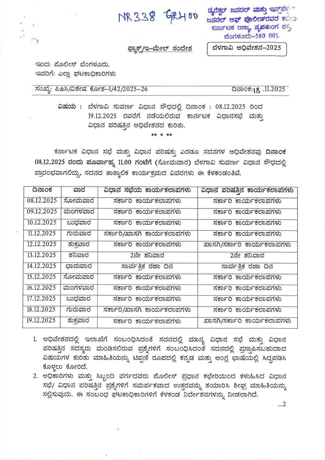 ಬೆಂಗಳೂರು : ಬೆಳಗಾವಿ ಸುವರ್ಣ ವಿಧಾನ ಸೌಧದಲ್ಲಿ ದಿನಾಂಕ : 08.12.2025 ರಿಂದ 19.12.2025 ರವರೆಗೆ ನಡೆಯಲಿರುವ ಕಾರ್ನಟಕ ವಿಧಾನಸಭೆ ಮತ್ತು ವಿಧಾನ ಪರಿಷತ್ತಿನ ಅಧಿವೇಶನ ನಡೆಯಲಿದೆ.