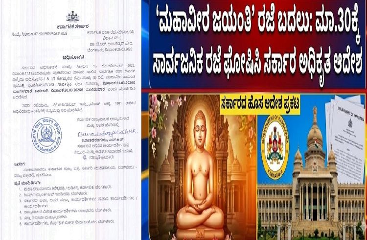 ಬೆಂಗಳೂರು: ಕರ್ನಾಟಕ ರಾಜ್ಯ ಸರ್ಕಾರವು 2026ನೇ ಸಾಲಿನ ಮಹಾವೀರ ಜಯಂತಿಯ ಸಾರ್ವತ್ರಿಕ ರಜೆಯ ದಿನಾಂಕದಲ್ಲಿ ಮಹತ್ವದ ತಿದ್ದುಪಡಿ ಮಾಡಿ ಆದೇಶ ಹೊರಡಿಸಿದೆ. ಈ ಬದಲಾವಣೆಯು ರಾಜ್ಯದ ಸರ್ಕಾರಿ ನೌಕರರು ಹಾಗೂ ಸಾರ್ವಜನಿಕರಿಗೆ ಅನ್ವಯವಾಗಲಿದೆ.