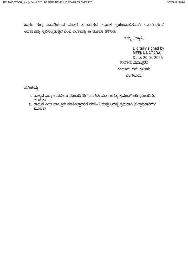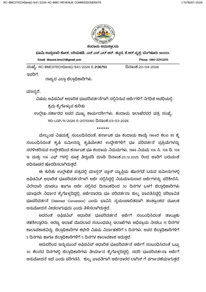 ಕರ್ನಾಟಕ ಭೂ ಕಂದಾಯ ಕಾಯ್ದೆ 1964ರ ಕಲಂ 95ರ ಅಡಿಯಲ್ಲಿ ಭೂ ಪರಿವರ್ತನೆ ಪ್ರಕ್ರಿಯೆಯನ್ನು ಸುಲಭಗೊಳಿಸಲು ಸರ್ಕಾರ ಈ ಮಹತ್ವದ ಕ್ರಮ ಕೈಗೊಂಡಿದೆ. ಮಾಸ್ಟರ್ ಪ್ಲಾನ್ ವ್ಯಾಪ್ತಿಯ ಹೊರಗಿರುವ ಜಮೀನುಗಳಿಗೆ ಸಂಬಂಧಿಸಿದಂತೆ ಅಫಿಡವಿಟ್ ಆಧಾರಿತ ಅರ್ಜಿಗಳನ್ನು ಸಲ್ಲಿಸಿದಾಗ, ಅಧಿಕಾರಿಗಳು ಕಾಲಮಿತಿಯೊಳಗೆ ಕಾರ್ಯನಿರ್ವಹಿಸುವುದು ಇನ್ನು ಮುಂದೆ ಕಡ್ಡಾಯವಾಗಲಿದೆ.
