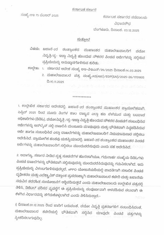 1) ದಿನಾಂಕ:01.12.2025 ರಿಂದ ಜಾರಿಗೆ ಬರುವಂತೆ. ವಯೋ ನಿವೃತ್ತಿ ಪ್ರಕರಣಗಳಿಗೆ ಸಂಬಂಧಿಸಿದಂತೆ. ಮಹಾಲೇಖಪಾಲರ ಕಚೇರಿಯಲ್ಲಿ ಭೌತಿಕವಾಗಿ ಸಲ್ಲಿಸಿದ ಯಾವುದೇ ಪಿಂಚಣಿ ಪತ್ರಗಳನ್ನು ಸ್ವೀಕರಿಸಲಾಗುವುದಿಲ್ಲ.