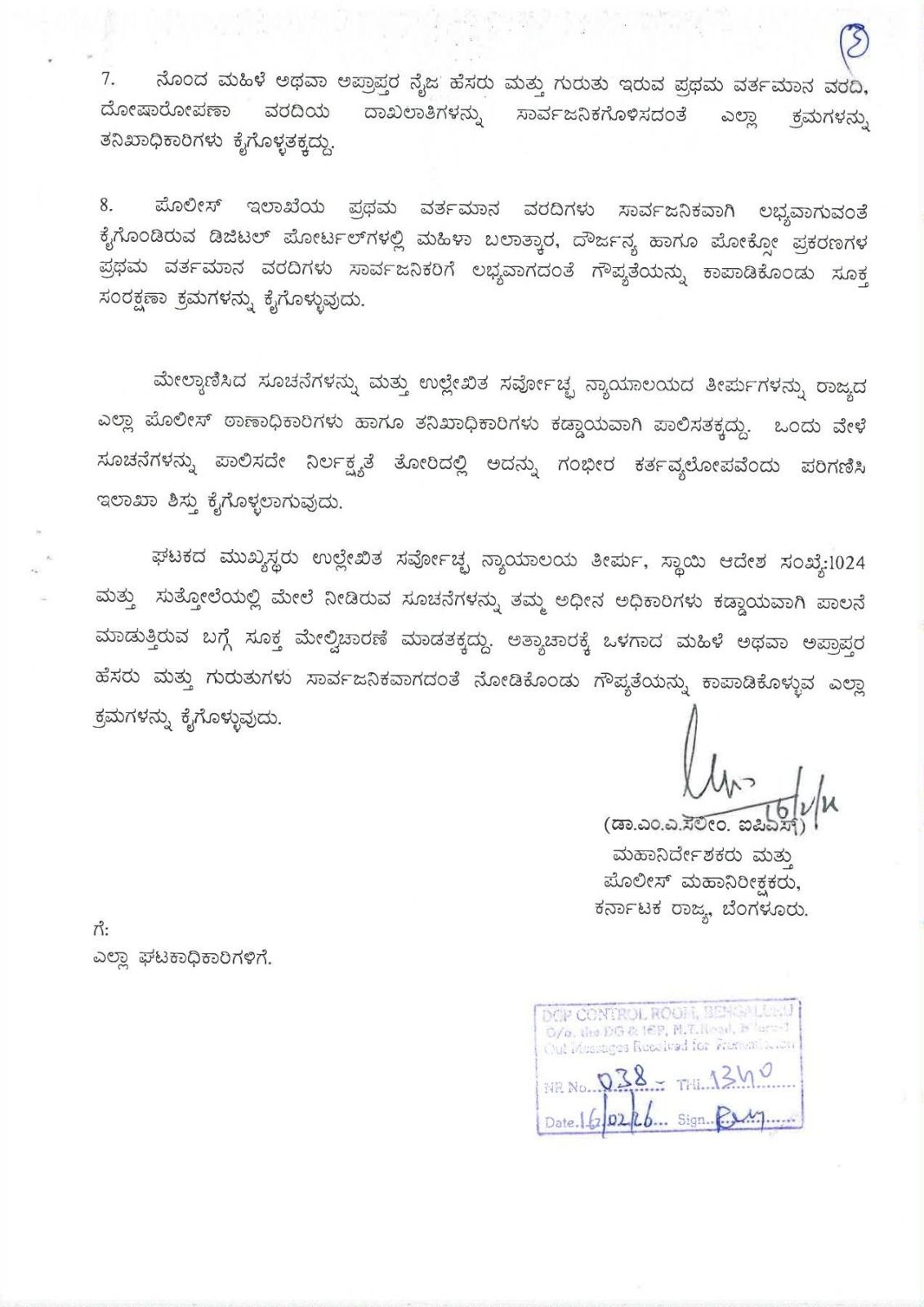 ಆದರೆ ಈ ಕಛೇರಿಯು ಸ್ಥಾಯಿ ಆದೇಶ ಸಂ. 1024 ರಲ್ಲಿ ನ್ಯಾಯಾಲಯದ ತೀರ್ಪಿನಲ್ಲಿ ನೀಡಿದ ಸೂಚನೆಗಳನ್ನು ನೀಡಿದ್ದರು ಸಹ ಕೆಲವು ಪೊಲೀಸ್ ಠಾಣೆಗಳ ಠಾಣಾಧಿಕಾರಿಗಳು ಮತ್ತು ತನಿಖಾಧಿಕಾರಿಗಳು ಮಹಿಳೆಯರ ಮತ್ತು ಅಪ್ರಾಪ್ತ ಮಕ್ಕಳ ಮೇಲೆ ನಡೆಯುವ ಅತ್ಯಾಚಾರ ಮತ್ತು ಪೋಕೋ ಪ್ರಕರಣಗಳನ್ನು ದಾಖಲಿಸುವ ಸಂದರ್ಭದಲ್ಲಿ ಪ್ರಥಮ ವರ್ತಮಾನ ವರದಿಯಲ್ಲಿ ನೊಂದ ಮಹಿಳೆ ಅಥವಾ ಅಪ್ರಾಪ್ತರ ಹೆಸರು ಮತ್ತು ವಿಳಾಸಗಳನ್ನು ಸಾರ್ವಜನಿಕಗೊಳಿಸುವ ಮತ್ತು ತನಿಖಾ ವರದಿಯಲ್ಲಿಯೂ ಸಹ ಗೌಪ್ಯತೆಯನ್ನು ವಿಚಾರಣೆ ಕಾಪಾಡಿಕೊಳ್ಳದೇ ಇರುವುದು ಕಂಡುಬಂದಿದ್ದು, ಇದರಿಂದ ಪ್ರಕರಣಗಳು ನ್ಯಾಯಾಲಯದ ಸಂದರ್ಭದಲ್ಲಿ ಆಕ್ಷೇಪಣೆ ವ್ಯಕ್ತಪಡಿಸುವ ಸಾಧ್ಯತೆ ಇರುತ್ತದೆ, ಆದುದರಿಂದ ಇನ್ನುಮುಂದೆ ರಾಜ್ಯದ ಎಲ್ಲಾ ಪೊಲೀಸ್ ಠಾಣೆಗಳ ಠಾಣಾಧಿಕಾರಿಗಳು ಮತ್ತು ತನಿಖಾಧಿಕಾರಿಗಳಿಗೆ ಅತ್ಯಾಚಾರಕ್ಕೆ ಒಳಗಾದ ಮಹಿಳೆ ಮತ್ತು ಅಪ್ರಾಪ್ತರ ಹೆಸರು ಮತ್ತು ವಿಳಾಸಗಳ ಗೌಪ್ಯತೆಯನ್ನು ಕಾಪಾಡಿ, ಸಲ್ಲಿಸುವ ದಾಖಲಾತಿಗಳಲ್ಲಿ ಹೆಸರು, ಗುರುತು ಮತ್ತು ವಿಳಾಸವನ್ನು ಗೌಪ್ಯತೆ ಕಾಪಾಡುವ ಕುರಿತಂತೆ ಈ ಕೆಳಗಿನ ಸೂಚನೆಗಳನ್ನು ಕಡ್ಡಾಯವಾಗಿ ಪಾಲಿಸುವಂತೆ ತಿಳಿಸಿದೆ.