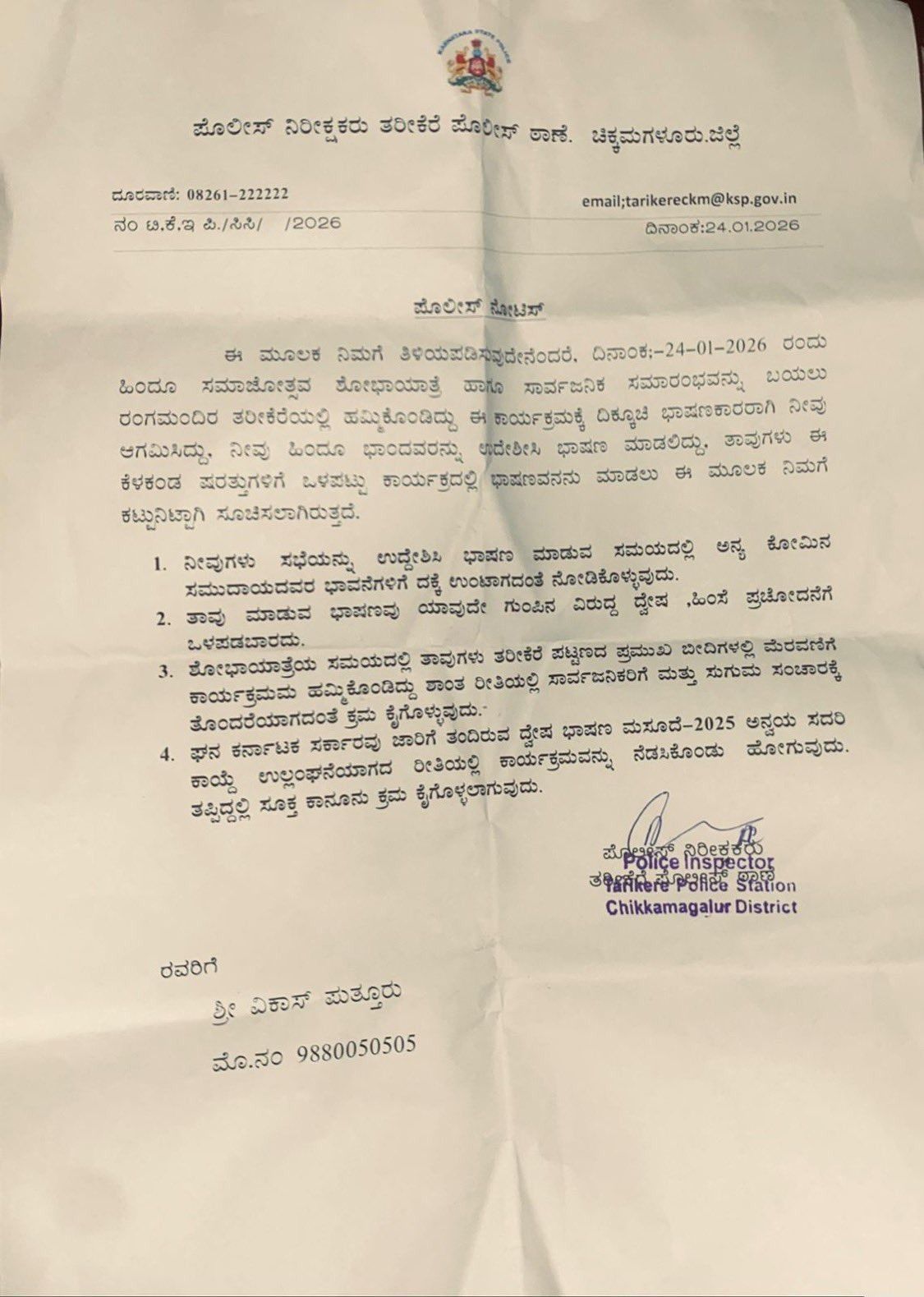 ಈ ಮೂಲಕ ನಿಮಗೆ ತಿಳಿಯಪಡಿಸುವುದೇನೆಂದರೆ, ದಿನಾಂಕ:-24-01-2026 ರಂದು ಹಿಂದೂ ಸಮಾಜೋತ್ಸವ ಶೋಭಾಯಾತ್ರೆ ಹಾಗೂ ಸಾರ್ವಜನಿಕ ಸಮಾರಂಭವನ್ನು ಬಯಲು ರಂಗಮಂದಿರ ತರೀಕೆರೆಯಲ್ಲಿ ಹಮ್ಮಿಕೊಂಡಿದ್ದು ಈ ಕಾರ್ಯಕ್ರಮಕ್ಕೆ ದಿಕ್ಕೂಚಿ ಭಾಷಣಕಾರರಾಗಿ ನೀವು ಆಗಮಿಸಿದ್ದು, ನೀವು ಹಿಂದೂ ಭಾಂದವರನ್ನು ಉದೇಶೀಸಿ ಭಾಷಣ ಮಾಡಲಿದ್ದು, ತಾವುಗಳು ಈ ಕೆಳಕಂಡ ಷರತ್ತುಗಳಿಗೆ ಒಳಪಟ್ಟು ಕಾರ್ಯಕ್ರದಲ್ಲಿ ಭಾಷಣವನನು ಮಾಡಲು ಈ ಮೂಲಕ ನಿಮಗೆ ಕಟ್ಟುನಿಟ್ಟಾಗಿ ಸೂಚಿಸಲಾಗಿರುತ್ತದೆ.