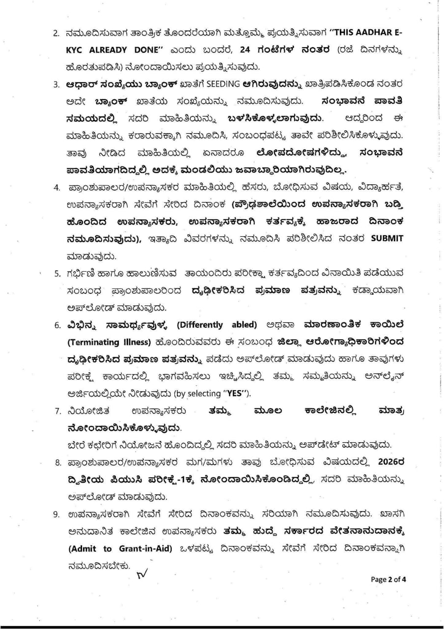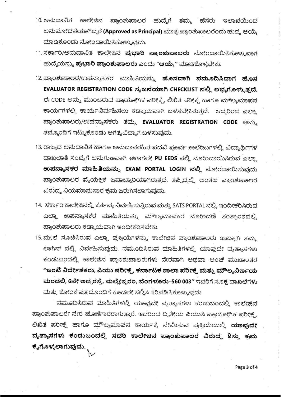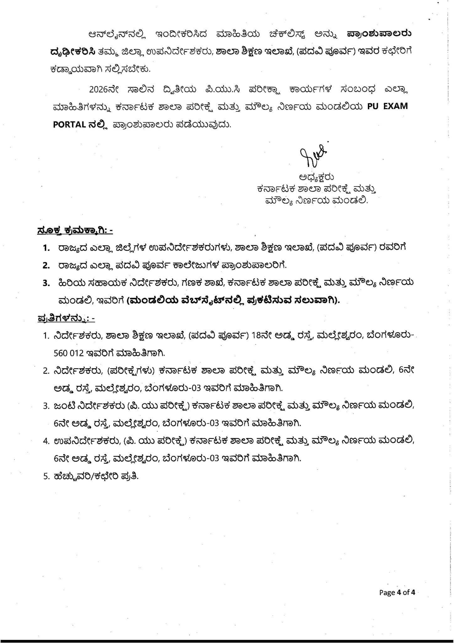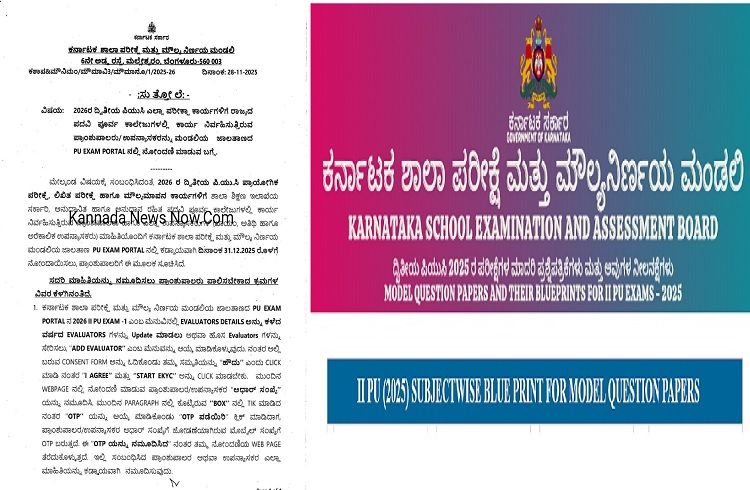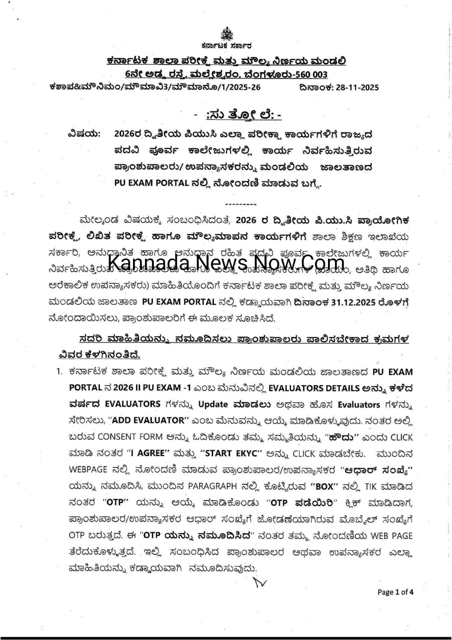 ಮೇಲ್ಕಂಡ ವಿಷಯಕ್ಕೆ ಸಂಬಂಧಿಸಿದಂತೆ, 2026 ರ ದ್ವಿತೀಯ ಪಿ.ಯು.ಸಿ ಪ್ರಾಯೋಗಿಕ ಪರೀಕ್ಷೆ, ಲಿಖಿತ ಪರೀಕ್ಷೆ ಹಾಗೂ ಮೌಲ್ಯಮಾಪನ ಕಾರ್ಯಗಳಿಗೆ ಶಾಲಾ ಶಿಕ್ಷಣ ಇಲಾಖೆಯ ಸರ್ಕಾರಿ, ಅನುದಾನಿತ ಹಾಗೂ ಅನುದಾನ ರಹಿತ ಪದವಿ ಪೂರ್ವ ಕಾಲೇಜುಗಳಲ್ಲಿ ಕಾರ್ಯ ನಿರ್ವಹಿಸುತ್ತಿರುವ ಪ್ರಾಂಶುಪಾಲರು ಹಾಗೂ ಎಲ್ಲಾ ಉಪನ್ಯಾಸಕರುಗಳ (ಖಾಯಂ, ಅತಿಥಿ ಹಾಗೂ ಅರೆಕಾಲಿಕ ಉಪನ್ಯಾಸಕರು) ಮಾಹಿತಿಯೊಂದಿಗೆ ಕರ್ನಾಟಕ ಶಾಲಾ ಪರೀಕ್ಷೆ ಮತ್ತು ಮೌಲ್ಯ ನಿರ್ಣಯ ಮಂಡಲಿಯ ಜಾಲತಾಣ PU EXAM PORTAL ನಲ್ಲಿ ಕಡ್ಡಾಯವಾಗಿ ದಿನಾಂಕ 31.12.2025 ರೊಳಗೆ ನೋಂದಾಯಿಸಲು, ಪ್ರಾಂಶುಪಾಲರಿಗೆ ಈ ಮೂಲಕ ಸೂಚಿಸಿದೆ.
