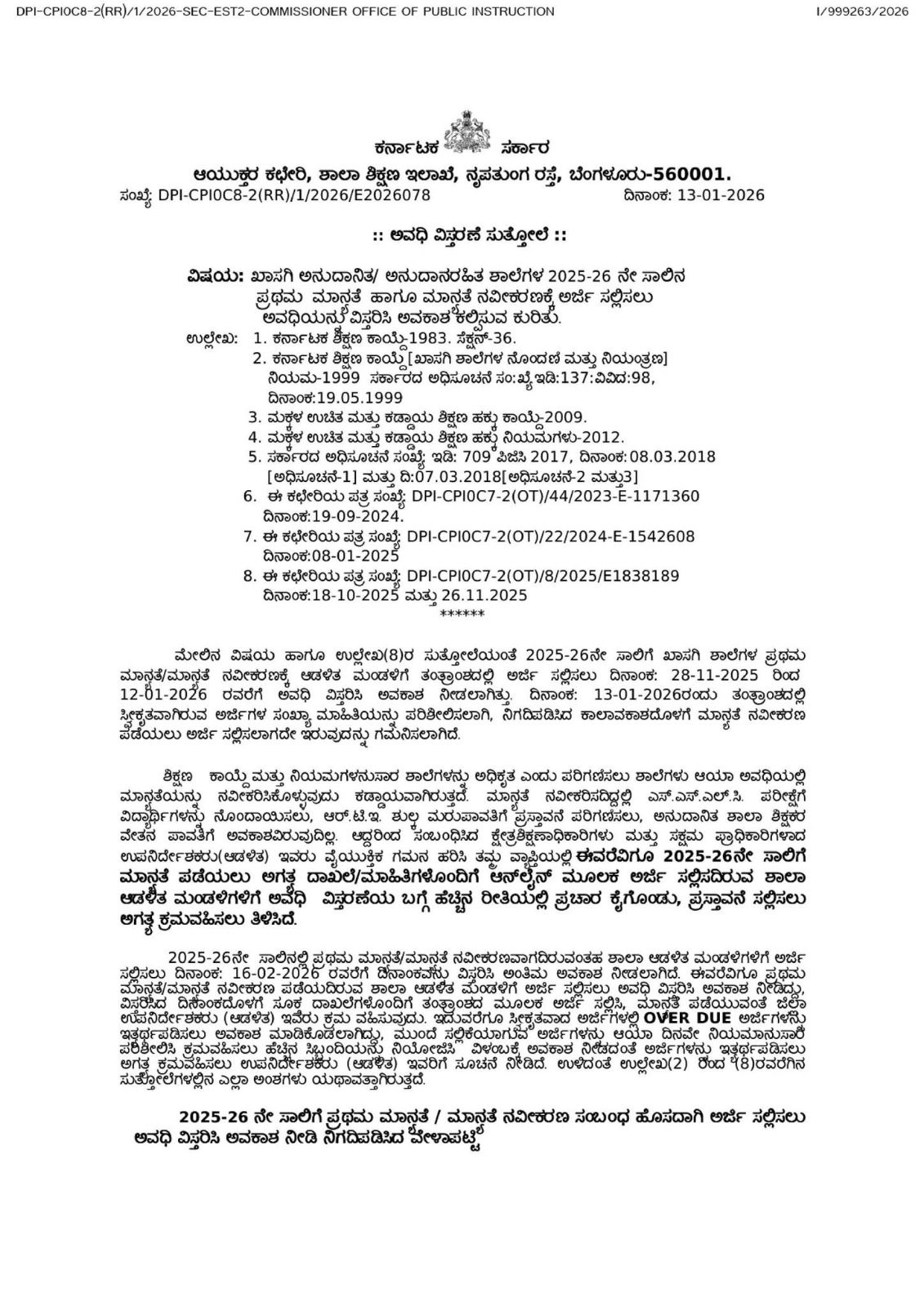 ಮೇಲಿನ ವಿಷಯ ಹಾಗೂ ಉಲ್ಲೇಖ(8)ರ ಸುತ್ತೋಲೆಯಂತೆ 2025-26ನೇ ಸಾಲಿಗೆ ಖಾಸಗಿ ಶಾಲೆಗಳ ಪ್ರಥಮ ಮಾನ್ಯತೆ/ಮಾನ್ಯತೆ ನವೀಕರಣಕ್ಕೆ ಆಡಳಿತ ಮಂಡಳಿಗೆ ತಂತ್ರಾಂಶದಲ್ಲಿ ಅರ್ಜಿ ಸಲ್ಲಿಸಲು ದಿನಾಂಕ: 28-11-2025 ರಿಂದ 12-01-2026 ರವರೆಗೆ ಅವಧಿ ವಿಸ್ತರಿಸಿ ಅವಕಾಶ ನೀಡಲಾಗಿತ್ತು. ದಿನಾಂಕ: 13-01-2026ರಂದು ತಂತ್ರಾಂಶದಲ್ಲಿ ಸ್ವೀಕೃತವಾಗಿರುವ ಅರ್ಜಿಗಳ ಸಂಖ್ಯಾ ಮಾಹಿತಿಯನ್ನು ಪರಿಶೀಲಿಸಲಾಗಿ, ನಿಗದಿಪಡಿಸಿದ ಕಾಲಾವಕಾಶದೊಳಗೆ ಮಾನ್ಯತೆ ನವೀಕರಣ ಪಡೆಯಲು ಅರ್ಜಿ ಸಲ್ಲಿಸಲಾಗದೇ ಇರುವುದನ್ನು ಗಮನಿಸಲಾಗಿದೆ.