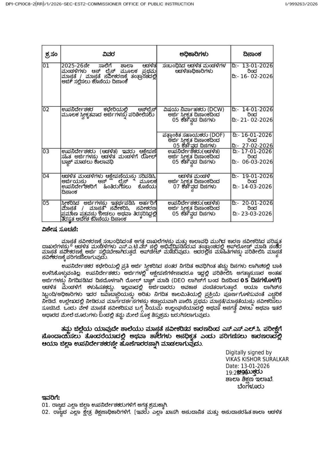 2025-26ನೇ ಸಾಲಿನಲ್ಲಿ ಪ್ರಥಮ ಮಾನತೆ/ಮಾನತೆ ನವೀಕರಣವಾಗದಿರುವಂತಹ ಶಾಲಾ ಆಡಳಿತ ಮಂಡಳಿಗಳಿಗೆ ಅರ್ಜಿ ಸಲ್ಲಿಸಲು ದಿನಾಂಕ: 16-02-2026 ರವರೆಗೆ ದಿನಾಂಕವನ್ನು ವಿಸ್ತರಿಸಿ ಅಂತಿಮ ಅವಕಾಶ ನೀಡಲಾಗಿದೆ. ಈವರೆವಿಗೂ ಪ್ರಥಮ ಮಾನತೆ/ಮಾನತೆ ನವೀಕರಣ ಪಡೆಯದಿರುವ ಶಾಲಾ ಆಡಳಿತ ಮಂಡಳಿಗೆ ಅರ್ಜಿ ಸಲ್ಲಿಸಲು ಅವಧಿ ವಿಸ್ತರಿಸಿ ಅವಕಾಶ ನೀಡಿದ್ದು, ವಿಸ್ತರಿಸಿದ ದಿನಾಂಕದೊಳಗೆ ಸೂಕ್ತ ದಾಖಲೆಗಳೊಂದಿಗೆ ತಂತ್ರಾಂಶದ ಮೂಲಕ ಅರ್ಜಿ ಸಲ್ಲಿಸಿ, ಮಾನತೆ ಪಡೆಯುವಂತೆ ಜಿಲ್ಲಾ ಉಪನಿರ್ದೇಶಕರು (ಆಡಳಿತ) ಇವೆರು ಕ್ರಮ ವಹಿಸುವುದು. ಇದುವರೆಗೂ ಸ್ವೀಕೃತವಾದ ಅರ್ಜಿಗಳಲ್ಲಿ OVER DUE ಅರ್ಜಿಗಳನ್ನು ಇತ್ತರ್ಥಪಡಿಸಲು ಅವಕಾಶ ಮಾಡಿಕೊಡಲಾಗಿದ್ದು, ಮುಂದೆ ಸಲ್ಲಿಕೆಯಾಗುವ ಅರ್ಜಿಗಳನ್ನು ಆಯಾ ದಿನವೇ ನಿಯಮಾನುಸಾರೆ ಪರಿಶೀಲಿಸಿ ಕ್ರಮವಹಿಸಲು ಹೆಚ್ಚಿನ ಸಿಬ್ಬಂದಿಯನು ನಿಯೋಜಿಸಿ” ವಿಳಂಬಕ್ಕೆ ಅವಕಾಶ ನೀಡಿದಂತೆ ಅರ್ಜಿಗಳನ್ನು ಇತರ್ಥಪಡಿಸಲು ಅಗತ್ಯ ಕ್ರಮವಹಿಸಲು ಉಪನಿರ್ದೇಶಕರು (ಆಡಳಿತ) ಇವರಿಗೆ ಸೂಚನೆ ನೀಡಿದೆ. ಉಳಿದಂತೆ ಉಲ್ಲೇಖ(2) ರಿಂದ (8)ರವರೆಗಿನ ಸುತ್ತೋಲೆಗಳಲ್ಲಿನ ಎಲ್ಲಾ ಅಂಶಗಳು ಯಥಾವತ್ತಾಗಿರುತ್ತದೆ.