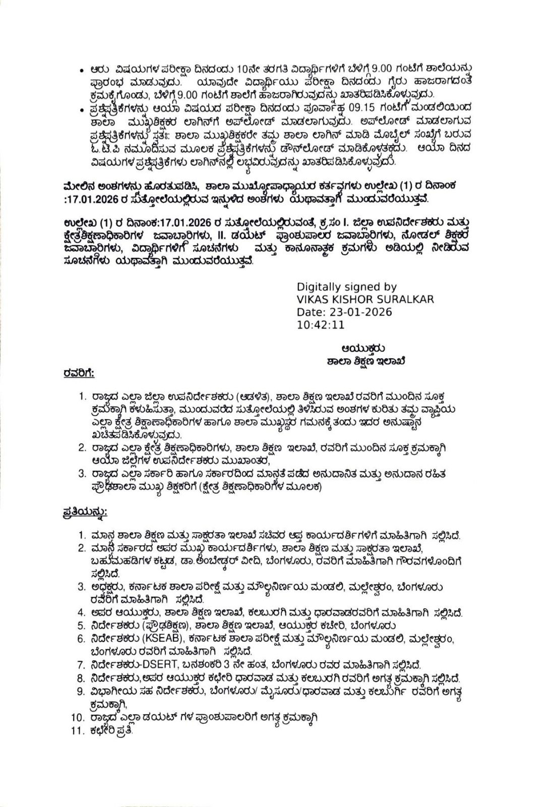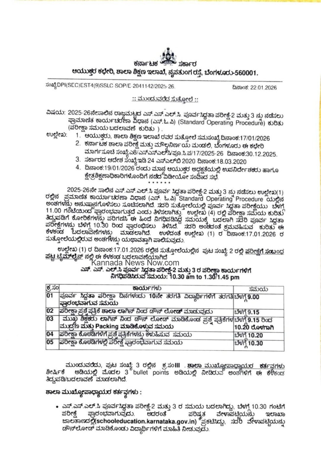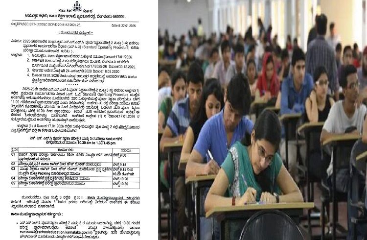 2025-26ನೇ ಸಾಲಿನ ಎಸ್.ಎಸ್.ಎಲ್.ಸಿ ಪೂರ್ವ ಸಿದ್ದತಾ ಪರೀಕ್ಷೆ-2 ಮತ್ತು 3 ನ್ನು ನಡೆಸಲು ಉಲ್ಲೇಖ(1) ರಲ್ಲಿನ ಪ್ರಮಾಣಿತ ಕಾರ್ಯಾಚರಣಾ ವಿಧಾನ (ಎಸ್. ಓ.ಪಿ) Standard Operating Procedure ಯಲ್ಲಿನ ಅಂಶಗಳನ್ನು ಅನುಷ್ಠಾನಗೊಳಿಸಲು ಸೂಚಿಸಲಾಗಿದೆ. ಸದರಿ ಸುತ್ತೋಲೆಯಲ್ಲಿ ಪೂರ್ವ ಸಿದ್ಧತಾ ಪರೀಕ್ಷೆಯು ಬೆಳಗ್ಗೆ 11.00 ಗಂಟೆಯಿಂದ ಪ್ರಾರಂಭವಾಗುತ್ತದೆ ಎಂದು ತಿಳಿಸಲಾಗಿತ್ತು. ಉಲ್ಲೇಖ (4) ರಲ್ಲಿ ಪರೀಕ್ಷಾ ಸಮಯ ಕುರಿತು ತಿದ್ದುಪಡಿಗೆ ಕೋರಿಕೆಗಳನ್ನು ಪರಿಗಣಿಸಿ ಈ ಹಿಂದೆ ನಿಗಧಿಪಡಿಸಿದ್ದ ಸಮಯಕ್ಕೆ ಬದಲಾಗಿ ಸದರಿ ಪೂರ್ವ ಸಿದ್ದತಾ ಪರೀಕ್ಷೆಗಳನ್ನು ಬೆಳಿಗ್ಗೆ 10.30 ರಿಂದ ಪ್ರಾರಂಭಿಸಲು ತಿಳಿಸಿದೆ. ಸದರಿ ಅಂಶದಂತೆ ಕ್ರಮವಹಿಸುವ ಕುರಿತು ಈ ಕೆಳಕಂಡ ಓದಲಾವಣೆಗಳನ್ನು ಮಾಡಲಾಗಿದೆ. ಉಳಿದಂತೆ ಉಲ್ಲೇಖ (1) ರ ದಿನಾಂಕ:17.01.2026 ರ ಸುತ್ತೋಲೆಯಲ್ಲಿರುವ ಅಂಶಗಳನ್ನು ಯಥಾವತ್ತಾಗಿ ಪಾಲಿಸುವುದು.