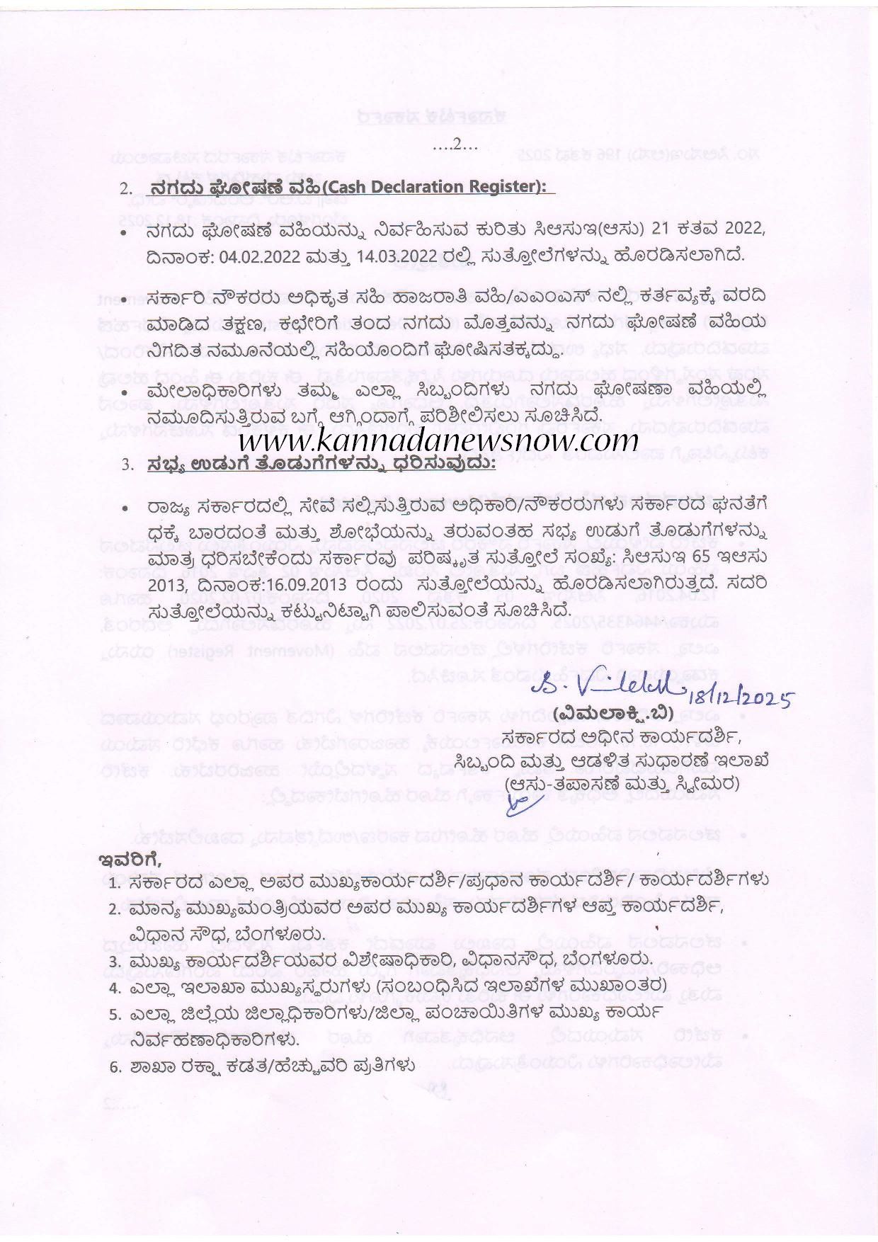 ಬೆಂಗಳೂರು :  ರಾಜ್ಯ ಸರ್ಕಾರದ ಕಛೇರಿಗಳಲ್ಲಿ ಸರ್ಕಾರಿ ನೌಕರರು ಚಲನವಲನ ವಹಿ (Movement Register) ಮತ್ತು ನಗದು ಘೋಷಣೆ ವಹಿ (Cash Declaration Register) ಯನ್ನು ನಿರ್ವಹಣೆ ಮಾಡದಿರುವುದು, ಸಭ್ಯ ಉಡುಗೆ ತೊಡುಗೆಗಳನ್ನು ಧರಿಸದಿರುವ ಕುರಿತು ಸಾರ್ವಜನಿಕರಿಂದ/ಸಂಘ ಸಂಸ್ಥೆಗಳಿಂದ ಹಲವಾರು ದೂರುಗಳು ಸ್ವೀಕೃತವಾಗುತ್ತಿವೆ. ಈ ಕುರಿತು ಈ ಹಿಂದೆ ಹಲವು ಸುತ್ತೋಲೆಗಳನ್ನು ಹೊರಡಿಸಲಾಗಿರುತ್ತದೆ. ಆದಾಗ್ಯೂ ಸದರಿ ಸುತ್ತೋಲೆಗಳನ್ನು ಪಾಲನೆ ಮಾಡದಿರುವುದನ್ನು ಸರ್ಕಾರವು ಗಂಭೀರವಾಗಿ ಪರಿಗಣಿಸಿದ್ದು, ಈ ಕೆಳಕಂಡ ಸೂಚನೆಗಳನ್ನು ಕಟ್ಟುನಿಟ್ಟಾಗಿ ಪಾಲಿಸುವಂತೆ ನಿರ್ದೇಶಿಸಿದೆ.