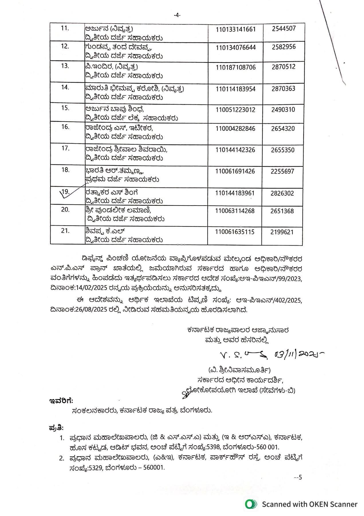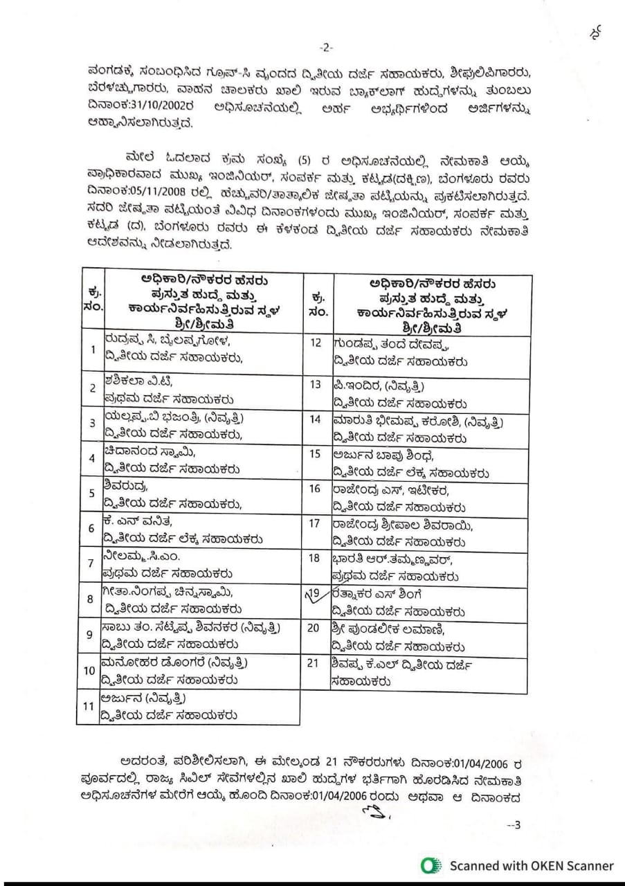 ಮೇಲೆ ಓದಲಾದ ಕ್ರಮ ಸಂಖ್ಯೆ (5) ರ ಅಧಿಸೂಚನೆಯಲ್ಲಿ ನೇಮಕಾತಿ ಆಯ್ಕೆ ಪ್ರಾಧಿಕಾರವಾದ ಮುಖ್ಯ ಇಂಜಿನಿಯರ್, ಸಂಪರ್ಕ ಮತ್ತು ಕಟ್ಟಡ(ದಕ್ಷಿಣ), ಬೆಂಗಳೂರು ರವರು ದಿನಾಂಕ:05/11/2008 ರಲ್ಲಿ ಹೆಚ್ಚುವರಿ/ತಾತ್ಕಾಲಿಕ ಜೇಷ್ಠತಾ ಪಟ್ಟಿಯನ್ನು ಪ್ರಕಟಿಸಲಾಗಿರುತ್ತದೆ. ಸದರಿ ಜೇಷ್ಠತಾ ಪಟ್ಟಿಯಂತೆ ವಿವಿಧ ದಿನಾಂಕಗಳಂದು ಮುಖ್ಯ ಇಂಜಿನಿಯರ್, ಸಂಪರ್ಕ ಮತ್ತು ಕಟ್ಟಡ (ದ), ಬೆಂಗಳೂರು ರವರು ಈ ಕೆಳಕಂಡ ದ್ವಿತೀಯ ದರ್ಜೆ ಸಹಾಯಕರು ನೇಮಕಾತಿ ಆದೇಶವನ್ನು ನೀಡಲಾಗಿರುತ್ತದೆ.