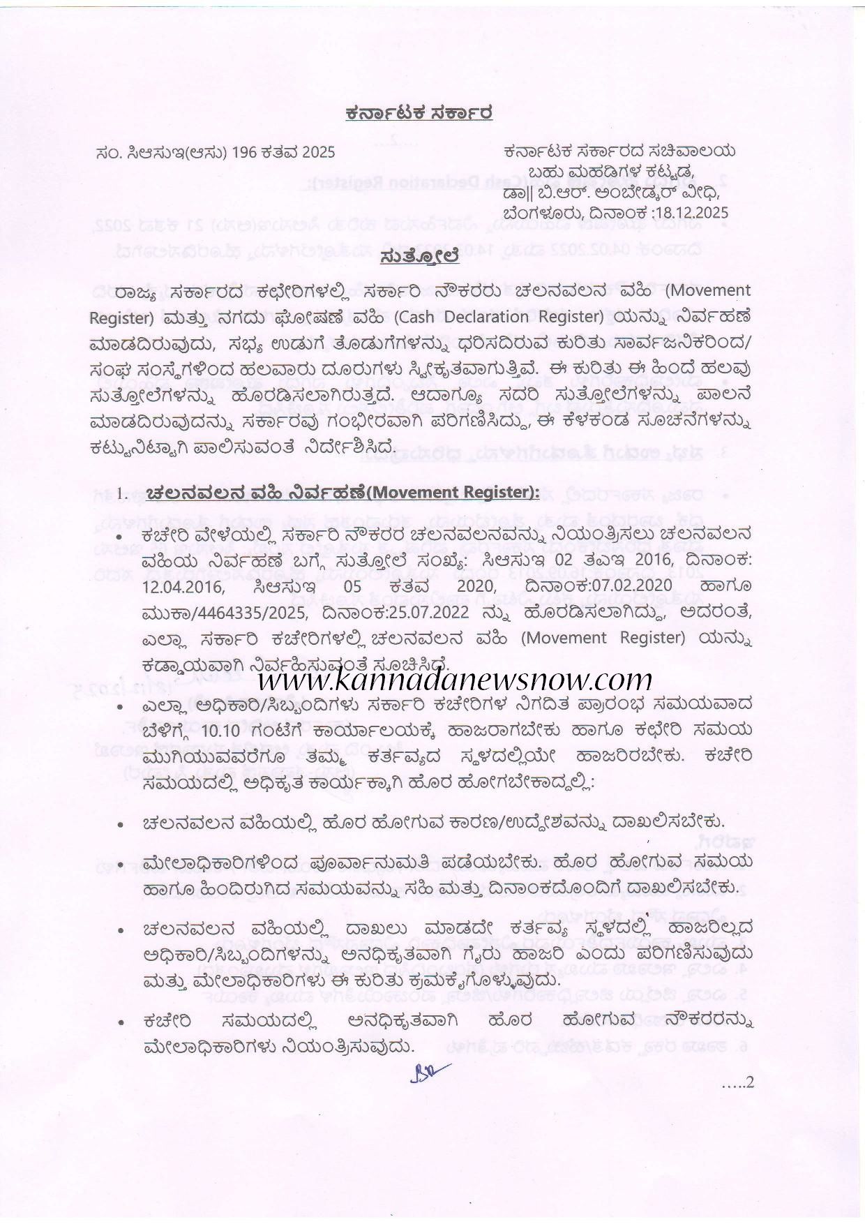 ಕಚೇರಿ ವೇಳೆಯಲ್ಲಿ ಸರ್ಕಾರಿ ನೌಕರರ ಚಲನವಲನವನ್ನು ನಿಯಂತ್ರಿಸಲು ಚಲನವಲನ ವಹಿಯ ನಿರ್ವಹಣೆ ಬಗ್ಗೆ ಸುತ್ತೋಲೆ ಸಂಖ್ಯೆ: ಸಿಆಸುಇ 02 ತಎಇ 2016, ದಿನಾಂಕ: 12.04.2016, ಸಿಆಸುಇ 05 ಕತವ 2020, ໖:07.02.2020 ಹಾಗೂ /4464335/2025, ໖:25.07.2022 , 03, ಎಲ್ಲಾ ಸರ್ಕಾರಿ ಕಚೇರಿಗಳಲ್ಲಿ ಚಲನವಲನ ವಹಿ (Movement Register) ಯನ್ನು ಕಡ್ಡಾಯವಾಗಿ ನಿರ್ವಹಿಸುವಂತೆ ಸೂಚಿಸಿದೆ.