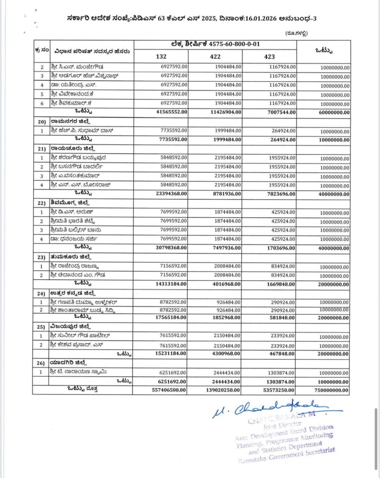 ಈ ಕುರಿತಂತೆ ಯೋಜನೆ, ಕಾರ್ಯಕ್ರಮ ಸಂಯೋಜನೆ ಮತ್ತು ಸಾಂಖ್ಯಿಕ ಇಲಾಖೆಯ ಜಂಟಿ ನಿರ್ದೇಶಕರು ಹಾಗೂ ಪದನಿಮಿತ್ತ ಸರ್ಕಾರದ ಉಪ ಕಾರ್ಯದರ್ಶಿಯವು ನಡವಳಿಯನ್ನು ಹೊರಡಿಸಿದ್ದಾರೆ. ಅದರಲ್ಲಿ ಯೋಜನೆ, ಕಾರ್ಯಕ್ರಮ ಸಂಯೋಜನೆ ಮತ್ತು ಸಾಂಖ್ಯಿಕ ಇಲಾಖೆಯ ಅಧೀನದಲ್ಲಿ ಬರುವ ವಿವಿಧ ಇಲಾಖೆ/ಸಂಸ್ಥೆ/ಮಂಡಳಿ/ಪ್ರಾಧಿಕಾರಗಳಿಗೆ ಸಂಬಂಧಿಸಿದಂತೆ ಯೋಜನಾ ಕಾರ್ಯಕ್ರಮಗಳನ್ನು 2025-26ನೇ ಸಾಲಿಗೆ ಮುಂದುವರೆಸಲಾಗಿದೆ ಹಾಗೂ ಪುಸಕ್ತ ಸಾಲಿನ ಆಯವ್ಯಯದಲ್ಲಿ ಕರ್ನಾಟಕ ಶಾಸಕರ ಸ್ಥಳೀಯ ಪುದೇಶಾಭಿವೃದ್ಧಿ ಯೋಜನೆಯಡಿ ಒಟ್ಟು ರೂ.60225.17 ಲಕ್ಷಗಳನ್ನು ಈ ಕೆಳಕಂಡಂತೆ ಒದಗಿಸಲಾಗಿದೆ ಎಂದಿದ್ದಾರೆ.