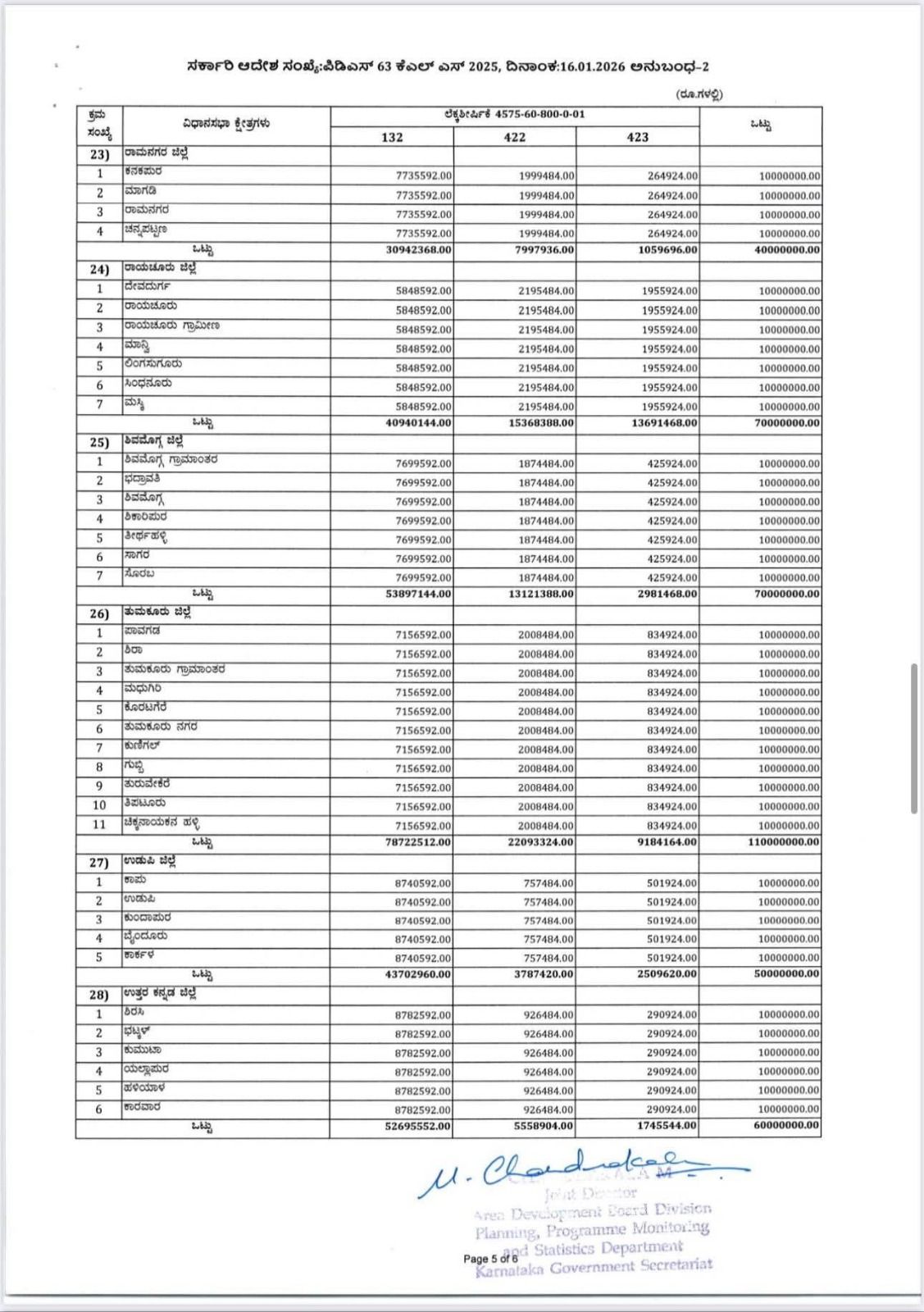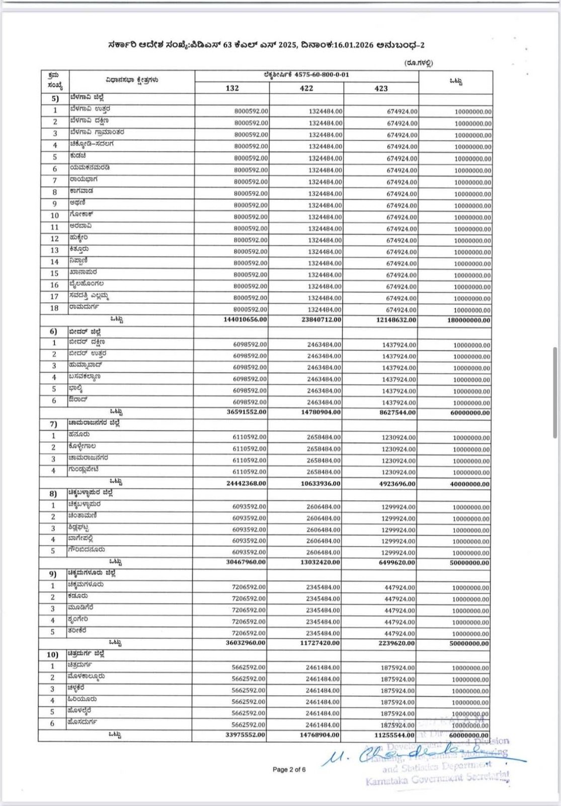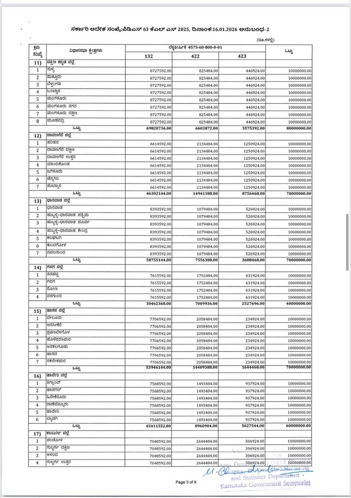 ಕರ್ನಾಟಕ ಶಾಸಕರ ಸ್ಥಳೀಯ ಪ್ರದೇಶಾಭಿವೃದ್ಧಿ ಯೋಜನೆಯಡಿ 2025-26 ನೇ ಸಾಲಿನಲ್ಲಿ, ಪಧಾನ ಲೆಕ್ಕಶೀರ್ಷಿಕೆ 2575 ರಡಿ ಕಂಡಿಕೆ 4.7 ರನ್ವಯ ಜಿಲ್ಲಾ ಮಟ್ಟದಲ್ಲಿ ಕಾರ್ಯನಿರ್ವಹಿಸುತ್ತಿರುವ ಸಿಬ್ಬಂದಿಗಳಿಗೆ ಲೆಕ್ಕ ಶೀರ್ಷಿಕೆ 2575-60-265-0-02-034 (ಗುತ್ತಿಗೆ/ಹೊರಗುತ್ತಿಗೆ) ರಡಿ 2025-26ನೇ ಸಾಲಿನಲ್ಲಿ ಒದಗಿಸಿರುವ ಅನುದಾನದ ಪೈಕಿ ರೂ.56.13287 ಲಕ್ಷಗಳನ್ನು, ಬಿಡುಗಡೆ ಮಾಡಲಾಗಿರುತ್ತದೆ.