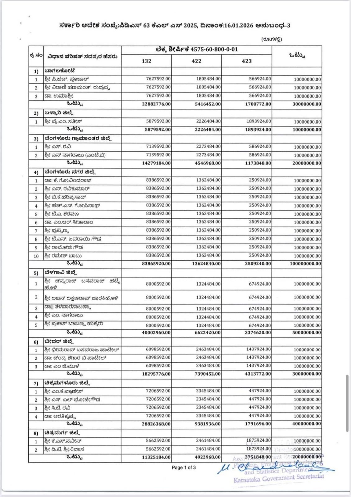 ಪುಸ್ತಾವನೆಯಲ್ಲಿ ವಿವರಿಸಿರುವಂತೆ, ಕರ್ನಾಟಕ ಶಾಸಕರ ಸ್ಥಳೀಯ ಪುದೇಶಾಭಿವೃದ್ಧಿ ಯೋಜನೆಯಡಿ 2025-26ನೇ ಸಾಲಿನ ಪ್ರಧಾನ ಲೆಕ್ಕಶೀರ್ಷಿಕೆ 4575 ರಡಿ ಮೂರು ಮತ್ತು ನಾಲ್ಕನೇ ಕಂತಾಗಿ ತಲಾ ರೂ.1.00 ಕೋಟಿಗಳನ್ನು ಅನುಬಂಧ-1ರಲ್ಲಿರುವ 31 ಜಿಲ್ಲೆಗಳ ಜಿಲ್ಲಾಧಿಕಾರಿಗಳಿಗೆ ಈ ಕೆಳಕಂಡ ಲೆಕ್ಕ ಶೀರ್ಷಿಕೆಗಳಡಿ ಒಟ್ಟು ರೂ.299.00/- ಕೋಟಿಗಳನ್ನು (ಎರಡು ನೂರ ತ್ತೊಂಬತ್ತೊಂಬತ್ತು ಕೋಟಿ ರೂಪಾಯಿಗಳು ಮಾತ್ರ ಬಿಡುಗಡೆ ಮಾಡಿದೆ. ಅನುಬಂಧ-2ರಲ್ಲಿ 224 ವಿಧಾನ ಸಭಾ ಕ್ಷೇತ್ರಗಳು ಮತ್ತು ಅನುಬಂಧ-3 ರಲ್ಲಿ 75 ಮಾನ್ಯ ವಿಧಾನ ಪರಿಷತ್ತಿನ ಸದಸ್ಯರ ವಿವರಗಳನ್ನು ಲಗತ್ತಿಸಿದೆ ಎಂದು ಹೇಳಿದ್ದಾರೆ.