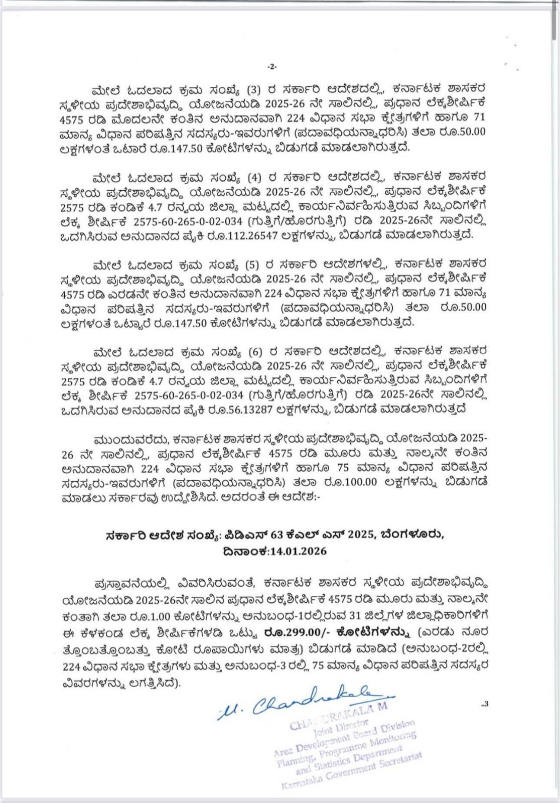 ಕರ್ನಾಟಕ ಶಾಸಕರ ಸ್ಥಳೀಯ ಪುದೇಶಾಭಿವೃದ್ಧಿ ಯೋಜನೆಯಡಿ 2025-26 ನೇ ಸಾಲಿನಲ್ಲಿ, ಪ್ರಧಾನ ಲೆಕ್ಕಶೀರ್ಷಿಕೆ 4575 ರಡಿ ಎರಡನೇ ಕಂತಿನ ಅನುದಾನವಾಗಿ 224 ವಿಧಾನ ಸಭಾ ಕ್ಷೇತ್ರಗಳಿಗೆ ಹಾಗೂ 71 ಮಾನ್ಯ ವಿಧಾನ ಪರಿಷತ್ತಿನ ಸದಸ್ಯರು-ಇವರುಗಳಿಗೆ (ಪದಾವಧಿಯನ್ನಾಧರಿಸಿ) ತಲಾ ರೂ.50.00 ಲಕ್ಷಗಳಂತೆ ಒಟ್ಟಾರೆ ರೂ.147.50 ಕೋಟಿಗಳನ್ನು ಬಿಡುಗಡೆ ಮಾಡಲಾಗಿರುತ್ತದೆ.