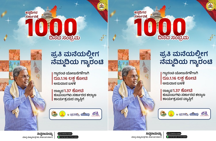 ಗ್ಯಾರಂಟಿ ಯೋಜನೆಗಳಿಗಾಗಿ ನಮ್ಮ ಸರ್ಕಾರವು ಕಳೆದ ಸಾವಿರ ದಿನಗಳಲ್ಲಿ ರೂ.1.16 ಲಕ್ಷ ಕೋಟಿ ಅನುದಾನ ಬಳಕೆ ಮಾಡಿದ್ದು, ರಾಜ್ಯದ 1.37 ಕೋಟಿ ಕುಟುಂಬಗಳನ್ನು ಸರ್ಕಾರದ ಯಾವುದಾದರೊಂದು ಕಲ್ಯಾಣ ಕಾರ್ಯಕ್ರಮದ ಫಲಾನುಭವಿಯಾಗಿಸಿದ ಇತಿಹಾಸ ಸೃಷ್ಟಿಸಿದೆ.