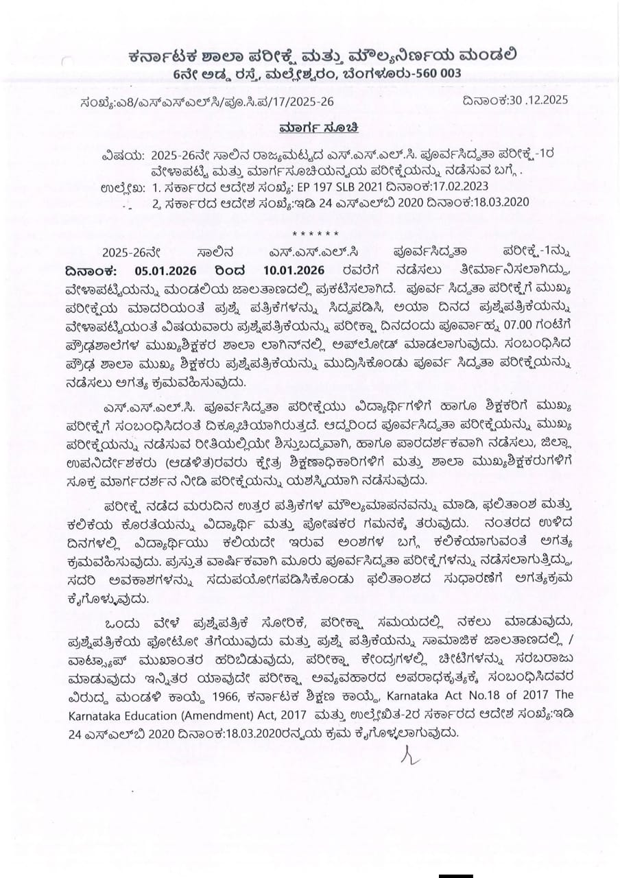 2025-263 ಸಾಲಿನ ಎಸ್.ಎಸ್.ಎಲ್.ಸಿ ಪೂರ್ವಸಿದ್ಧತಾ ಪರೀಕ್ಷೆ-1ನ್ನು 05.01.2026 ರಿಂದ 10.01.2026 ರವರೆಗೆ ನಡೆಸಲು ತೀರ್ಮಾನಿಸಲಾಗಿದ್ದು, ವೇಳಾಪಟ್ಟಿಯನ್ನು ಮಂಡಲಿಯ ಜಾಲತಾಣದಲ್ಲಿ ಪ್ರಕಟಿಸಲಾಗಿದೆ. ಪೂರ್ವ ಸಿದ್ದತಾ ಪರೀಕ್ಷೆಗೆ ಮುಖ್ಯ ಪರೀಕ್ಷೆಯ ಮಾದರಿಯಂತೆ ಪ್ರಶ್ನೆ ಪತ್ರಿಕೆಗಳನ್ನು ಸಿದ್ದಪಡಿಸಿ, ಅಯಾ ದಿನದ ಪ್ರಶ್ನೆಪತ್ರಿಕೆಯನ್ನು ವೇಳಾಪಟ್ಟಿಯಂತೆ ವಿಷಯವಾರು ಪ್ರಶ್ನೆಪತ್ರಿಕೆಯನ್ನು ಪರೀಕ್ಷಾ ದಿನದಂದು ಪೂರ್ವಾಹ್ನ 07.00 ಗಂಟೆಗೆ ಪ್ರೌಢಶಾಲೆಗಳ ಮುಖ್ಯಶಿಕ್ಷಕರ ಶಾಲಾ ಲಾಗಿನ್‌ನಲ್ಲಿ ಅಪ್‌ಲೋಡ್ ಮಾಡಲಾಗುವುದು. ಸಂಬಂಧಿಸಿದ ಪ್ರೌಢ ಶಾಲಾ ಮುಖ್ಯ ಶಿಕ್ಷಕರು ಪ್ರಶ್ನೆಪತ್ರಿಕೆಯನ್ನು ಮುದ್ರಿಸಿಕೊಂಡು ಪೂರ್ವ ಸಿದ್ಧತಾ ಪರೀಕ್ಷೆಯನ್ನು ನಡೆಸಲು ಅಗತ್ಯ ಕ್ರಮವಹಿಸುವುದು.