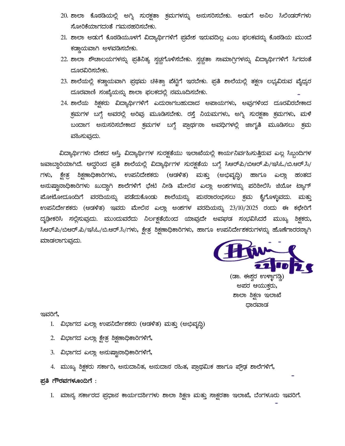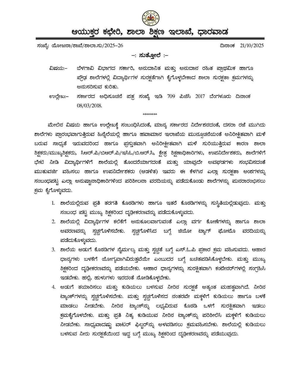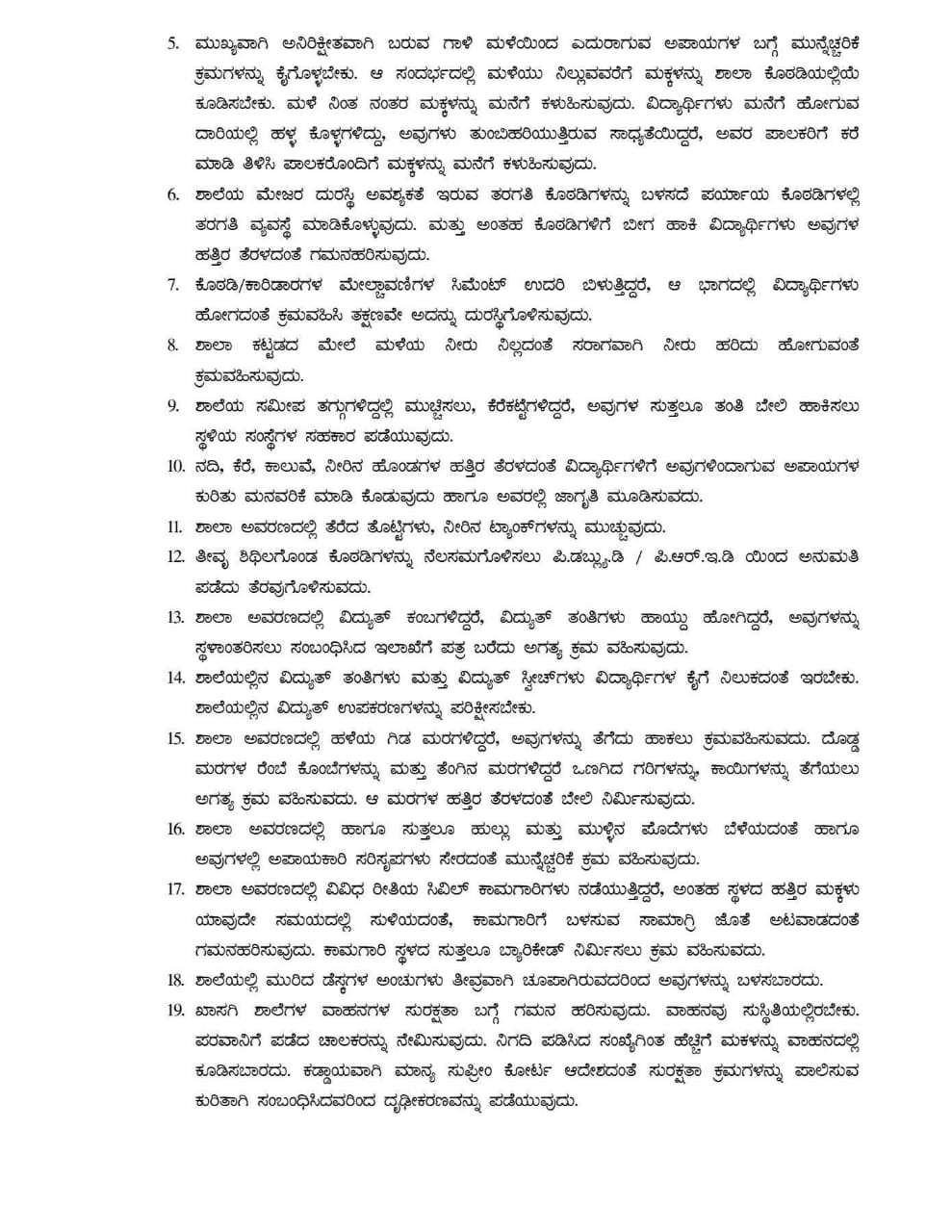 ಮೇಲಿನ ವಿಷಯ ಹಾಗೂ ಉಲ್ಲೇಖಕ್ಕೆ ಸಂಬಂಧಿಸಿದಂತೆ, ಮಾನ್ಯ ಸರ್ಕಾರದ ನಿರ್ದೇಶನದಂತೆ, ದಸರಾ ರಜೆ ಮುಗಿದು ಶಾಲೆಗಳು ಪ್ರಾರಂಭವಾಗುತ್ತಿರುವ ಹಿನ್ನೆಲೆಯಲ್ಲಿ ಹಾಗೂ ಹವಾಮಾನ ಇಲಾಖೆಯ ಮುನ್ಸೂಚನೆಯಂತೆ ಅನಿರೀಕ್ಷಿತವಾಗಿ ಮಳೆ ಬರುವ ಸಾಧ್ಯತೆ ಇರುವದರಿಂದ ಹಾಗೂ ಪ್ರಸ್ತುತವಾಗಿ ಅನಿರೀಕ್ಷಿತವಾಗಿ ಮಳೆ ಸುರಿಯುತ್ತಿರುವ ಕಾರಣ ಶಾಲಾ ಶಿಕ್ಷಕರು/ಮುಖ್ಯಶಿಕ್ಷಕರು, ಸಿಆರ್.ಪಿ/ಬಿಆರ್.ಪಿ/ಇಸಿಓ/ಬಿ.ಆರ್.ಸಿ, ಕ್ಷೇತ್ರ ಶಿಕ್ಷಣಾಧಿಕಾರಿಗಳು, ಉಪನಿರ್ದೇಶಕರು, ಶಾಲೆಗಳಿಗೆ ಭೇಟಿ ನೀಡಿ ವಿದ್ಯಾರ್ಥಿಗಳಿಗೆ ಶಾಲೆಯಲ್ಲಿ ತೊಂದರೆಯಾಗದಂತೆ ಮತ್ತು ಯಾವುದೇ ಅವಘಡಗಳು ಸಂಭವಿಸದಂತೆ ಮುತುವರ್ಜಿ ವಹಿಸಲು ಹಾಗೂ ಉಪನಿರ್ದೇಶಕರು (ಆಡಳಿತ) ಇವರು ಈ ಕೆಳಗಿನ ಎಲ್ಲಾ ಸುರಕ್ಷತಾ ಅಂಶಗಳನ್ನು ಸಂಬಂಧಪಟ್ಟ ಎಲ್ಲಾ ಅನುಷ್ಟಾನಾಧಿಕಾರಿಗಳಿಂದ ಪರಿಶೀಲನಾ ವರದಿಯನ್ನು ಪಡೆದುಕೊಂಡು ಶಾಲೆಗಳನ್ನು ಪುನರಾರಂಭಿಸಲು ಕ್ರಮ ಕೈಗೊಳ್ಳುವದು.