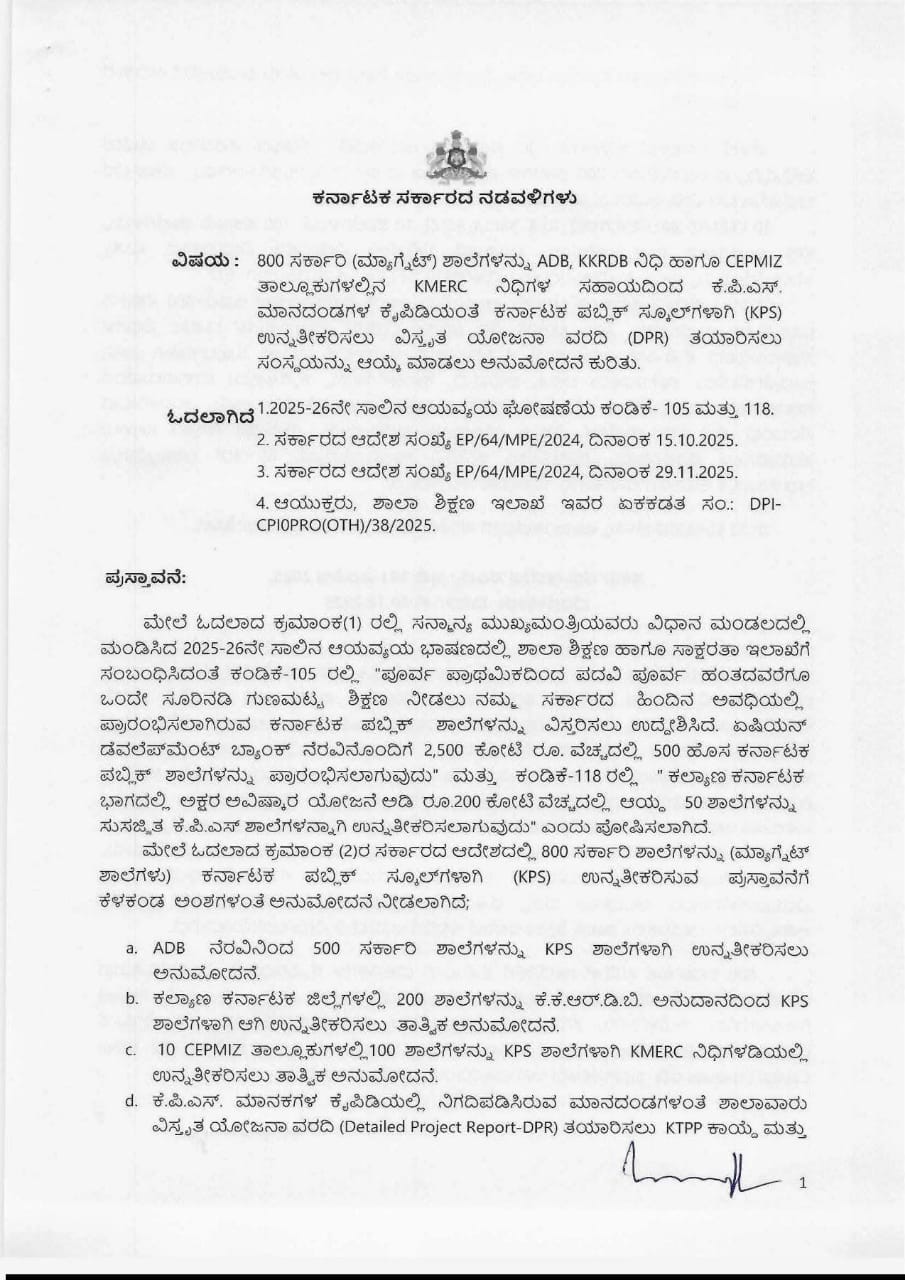 ಮೇಲೆ ಓದಲಾದ ಕ್ರಮಾಂಕ(1) ರಲ್ಲಿ ಸನ್ಮಾನ್ಯ ಮುಖ್ಯಮಂತ್ರಿಯವರು ವಿಧಾನ ಮಂಡಲದಲ್ಲಿ ಮಂಡಿಸಿದ 2025-26ನೇ ಸಾಲಿನ ಆಯವ್ಯಯ ಭಾಷಣದಲ್ಲಿ ಶಾಲಾ ಶಿಕ್ಷಣ ಹಾಗೂ ಸಾಕ್ಷರತಾ ಇಲಾಖೆಗೆ ಸಂಬಂಧಿಸಿದಂತೆ ಕಂಡಿಕೆ-105 ರಲ್ಲಿ “ಪೂರ್ವ ಪ್ರಾಥಮಿಕದಿಂದ ಪದವಿ ಪೂರ್ವ ಹಂತದವರೆಗೂ ಒಂದೇ ಸೂರಿನಡಿ ಗುಣಮಟ್ಟ ಶಿಕ್ಷಣ ನೀಡಲು ನಮ್ಮ ಸರ್ಕಾರದ ಹಿಂದಿನ ಅವಧಿಯಲ್ಲಿ ಪ್ರಾರಂಭಿಸಲಾಗಿರುವ ಕರ್ನಾಟಕ ಪಬ್ಲಿಕ್ ಶಾಲೆಗಳನ್ನು ವಿಸ್ತರಿಸಲು ಉದ್ದೇಶಿಸಿದೆ. ಏಷಿಯನ್ ಡೆವಲೆಪ್ಮೆಂಟ್ ಬ್ಯಾಂಕ್ ನೆರವಿನೊಂದಿಗೆ 2,500 ಕೋಟಿ ರೂ. ವೆಚ್ಚದಲ್ಲಿ 500 ಹೊಸ ಕರ್ನಾಟಕ ಪಬ್ಲಿಕ್ ಶಾಲೆಗಳನ್ನು ಪ್ರಾರಂಭಿಸಲಾಗುವುದು” ಮತ್ತು ಕಂಡಿಕೆ-118 ರಲ್ಲಿ ” ಕಲ್ಯಾಣ ಕರ್ನಾಟಕ ಭಾಗದಲ್ಲಿ ಅಕ್ಷರ ಅವಿಷ್ಕಾರ ಯೋಜನೆ ಅಡಿ ರೂ.200 ಕೋಟಿ ವೆಚ್ಚದಲ್ಲಿ ಆಯ್ದ 50 ಶಾಲೆಗಳನ್ನು ಸುಸಜ್ಜಿತ ಕೆ.ಪಿ.ಎಸ್ ಶಾಲೆಗಳನ್ನಾಗಿ ಉನ್ನತೀಕರಿಸಲಾಗುವುದು” ಎಂದು ಪೋಷಿಸಲಾಗಿದೆ.