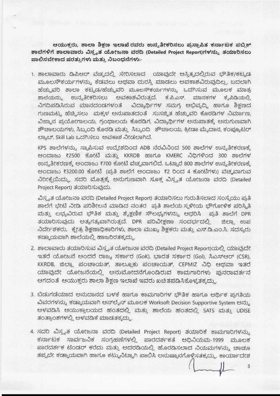 ಕರ್ನಾಟಕ ಪಬ್ಲಿಕ್ ಶಾಲೆಗಳ ಬಲವರ್ಧನೆಗಾಗಿ ಆಯ್ಕೆ 800 ಸರ್ಕಾರಿ ಶಾಲೆಗಳನ್ನು ಪೂರ್ವ ಪ್ರಾಥಮಿಕ ತರಗತಿಗಳಿಂದ ಪದವಿ ಪೂರ್ವ ತರಗತಿಗಳವರೆಗೆ ಪ್ರತಿ ತರಗತಿಯಲ್ಲಿ ಕನ್ನಡ ಮತ್ತು ಆಂಗ್ಲ ಮಾಧ್ಯಮಗಳಲ್ಲಿ ಎರಡು ಪ್ರತ್ಯೇಕ ತರಗತಿಗಳನ್ನು ನಡೆಸಲು ಮತ್ತು ಪ್ರತಿ ತರಗತಿಗೆ ಒಂದು ಕೊಠಡಿಯಂತೆ ಕನಿಷ್ಟ 1200 ವಿದ್ಯಾರ್ಥಿಗಳು ವ್ಯಾಸಂಗ ಮಾಡಲು ಅವಕಾಶ ಕಲ್ಪಿಸುವಂತೆ ಶಾಲೆಯಲ್ಲಿನ ತರಗತಿ ಕೊಠಡಿಗಳ ಕೊರತೆಯನ್ನು ‘ಕರ್ನಾಟಕ ಪಬ್ಲಿಕ್ ಶಾಲಾ ಮಾನಕ’ಗಳ ಕೈಪಿಡಿಯಲ್ಲಿ (KPS Book of Standards) ನಿಗದಿಪಡಿಸಿರುವ ಮಾನದಂಡಗಳಂತೆ ಗುರುತಿಸಿ, National Building Code ಮತ್ತು ಕರ್ನಾಟಕ ಲೋಕೋಪಯೋಗಿ ಇಲಾಖೆಯು ನಿಗದಿಪಡಿಸಿರುವ ಇತ್ತೀಚಿನ ಏಕರೂಪ ಅನುಸೂಚಿತ ದರಪಟ್ಟಿಯಂತೆ (Common Schedule of Rates) ಕಾಮಗಾರಿ ಕೈಗೊಳ್ಳಲು ಟೆಂಡರ್ ಆಹ್ವಾನಿಸಲು ಸಿದ್ಧವಾಗಿರುವಂತೆ ಶಾಲಾವಾರು ಪ್ರತ್ಯೇಕ ವಿಸ್ತ್ರತ ಯೋಜನಾ ವರದಿಯನ್ನು (Detailed Project Report) ತಯಾರಿಸಲು ಸಂಸ್ಥೆಯನ್ನು ಗುರುತಿಸಲು ಕೆ.ಟಿ.ಪಿ.ಪಿ. ಕಾಯ್ದೆ ಮತ್ತು ನಿಯಮಗಳನುಸಾರ ಅಂದಾಜು ವೆಚ್ಚ ರೂ.18.00 ಕೋಟಿಗಳಲ್ಲಿ ಪಾರದರ್ಶಕವಾಗಿ ಟೆಂಡರ್ ಆಹ್ವಾನಿಸಲು ಆಯುಕ್ತರು, ಶಾಲಾ ಶಿಕ್ಷಣ ಇಲಾಖೆ ಇವರಿಗೆ ಅನುಮತಿ ನೀಡಿ ಆದೇಶಿಸಲಾಗಿದೆ.