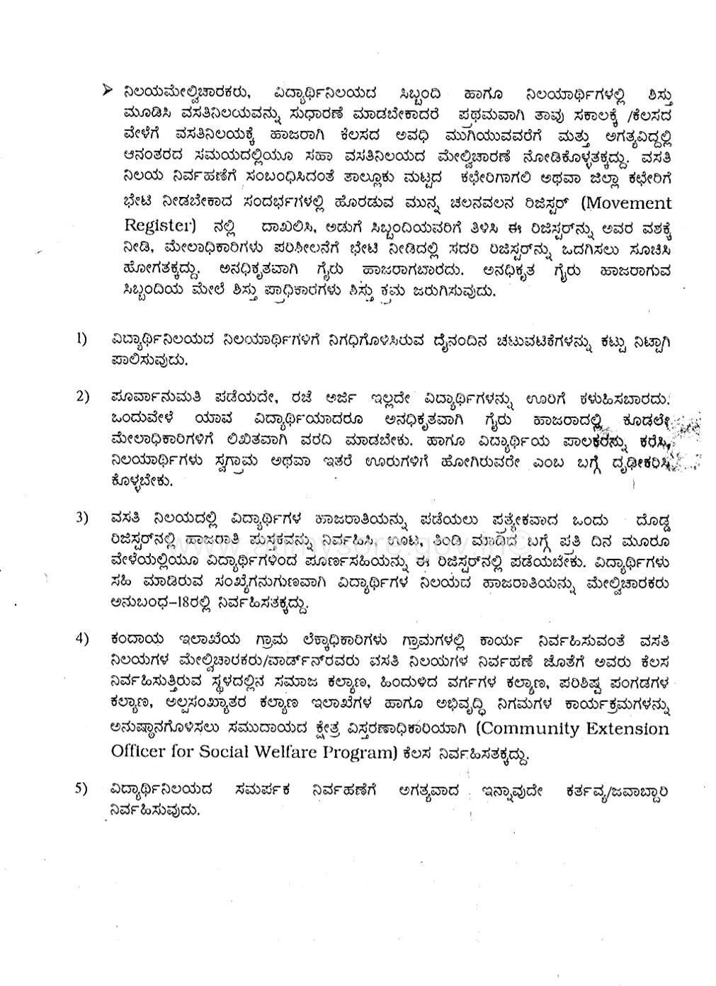 ಬೆಂಗಳೂರು : ವಿದ್ಯಾರ್ಥಿನಿಲಯಗಳ ನಿರ್ವಹಣೆಯಲ್ಲಿ ನಿಲಯ ಮೇಲ್ವಿಚಾರಕರ ಪಾತ್ರ ಮುಖ್ಯವಾಗಿದ್ದು, ನಿಲಯದ ಸಮರ್ಪಕ / ಅಸಮರ್ಪಕ ನಿರ್ವಹಣೆಗೆ ನಿಲಯ ಮೇಲ್ವಿಚಾರಕರೇ ಬಹಳಮಟ್ಟಿಗೆ ಕಾರಣರಾಗಿರುತ್ತಾರೆ. ಅದ್ದರಿಂದ ಈ ಕೆಳಕಂಡ ಕರ್ತವ್ಯಗಳನ್ನು ನಿರ್ವಹಿಸುವುದು.