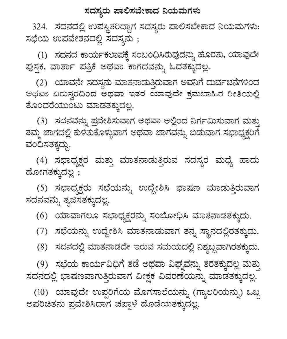 324. ಸದನದಲ್ಲಿ ಉಪಸ್ಥಿತರಿದ್ದಾಗ ಸದಸ್ಯರು ಪಾಲಿಸಬೇಕಾದ ನಿಯಮಗಳು: ಸಭೆಯ ಉಪವೇಶನದಲ್ಲಿ ಸದಸ್ಯನು ;