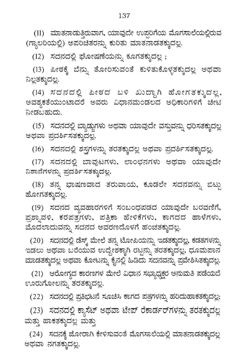 (1) ಸದನದ ಕಾರ್ಯಕಲಾಪಕ್ಕೆ ಸಂಬಂಧಿಸಿರುವುದನ್ನು ಹೊರತು, ಯಾವುದೇ ಪುಸ್ತಕ, ವಾರ್ತಾ ಪತ್ರಿಕೆ ಅಥವಾ ಕಾಗದವನ್ನು ಓದತಕ್ಕುದಲ್ಲ.