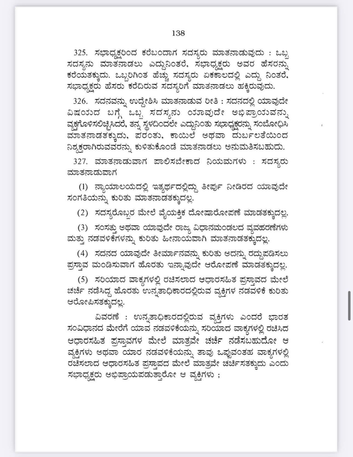 325. ಸಭಾಧ್ಯಕ್ಷರಿಂದ ಕರೆಬಂದಾಗ ಸದಸ್ಯರು ಮಾತನಾಡುವುದು : ಒಬ್ಬ ಸದಸ್ಯನು ಮಾತನಾಡಲು ಎದ್ದು ನಿಂತರೆ, ಸಭಾಧ್ಯಕ್ಷರು ಅವರ ಹೆಸರನ್ನು ಕರೆಯತಕ್ಕುದು. ಒಬ್ಬರಿಗಿಂತ ಹೆಚ್ಚು ಸದಸ್ಯರು ಏಕಕಾಲದಲ್ಲಿ ಎದ್ದು ನಿಂತರೆ, ಸಭಾಧ್ಯಕ್ಷರು ಹೆಸರು ಕರೆದಿರುವ ಸದಸ್ಯರಿಗೆ ಮಾತನಾಡಲು ಹಕ್ಕಿರುವುದು.